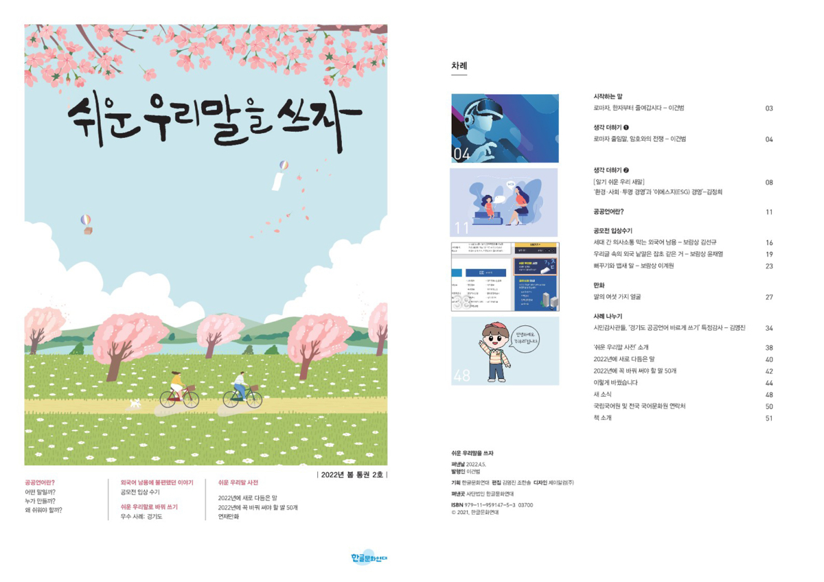 공공언어에서 쉬운 우리말 문화를 꽃피우기 위해, 「쉬운 우리말을 쓰자」 잡지를 계절마다 발행합니다.