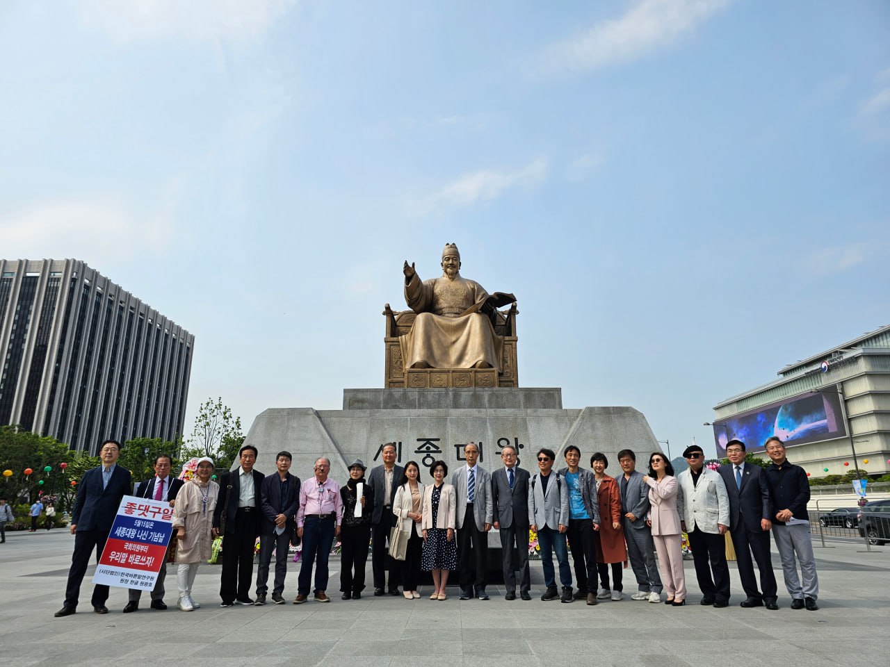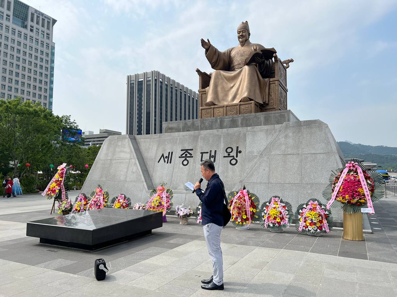 2023년 5월 15일, 제626돌 세종대왕 탄신일을 맞아 한글문화연대에서 이건범 대표와 김명진 부대표가 광화문 광장 세종대왕 동상 앞에서 열었던 5월 15일(월) 꽃 바치기 행사에 참여했습니다.