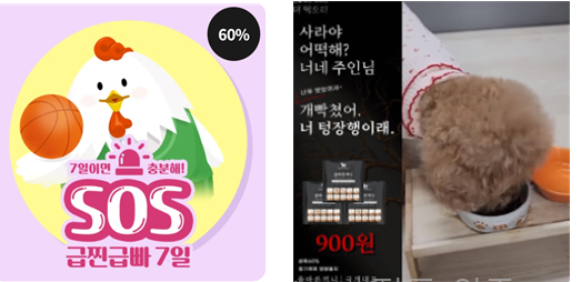 닭가슴살 판매 기업 ‘바르닭’에서는 ‘급하게 찐 살, 급하게 빼자’의 준말인 ‘급찐급빠’로 제품을 광고한다. 강아지 사료 광고에서는 최근 드라마 <더 글로리>에서 유명해진 ‘사라야 어떡해? 너네 주님 개빡쳤어. 너 지옥행이래.’라는 대사를 활용해 ‘개빡쳤어(화나다를 속되게 이르는 표현). 너 텅장행이래(텅빈 통장으로 가는 길)’라는 문구로 강아지 사료를 광고한다. 원래 대사에 있던 비속어를 광고에 그대로 적용하면서 비속어, 신조어를 남용한다.