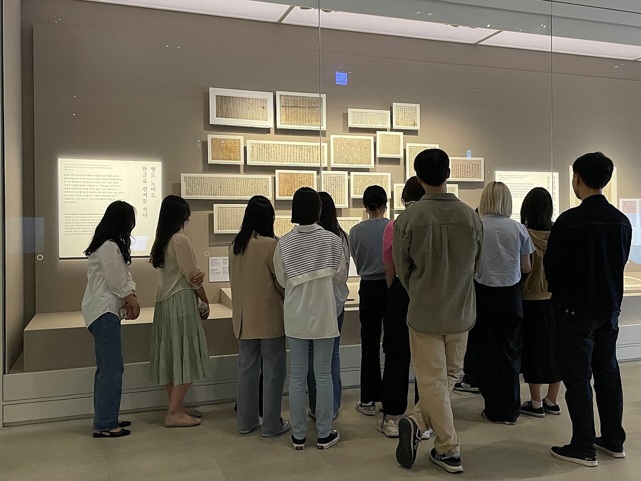 한글문화연대 대학생기자단은 오후 행사에 앞서 국립한글박물관에서 훈민정음의 역사를 배우는 시간을 가졌다. 먼저 박물관 2층 상설전시관에서 열린 <훈민정음, 천년의 문자 계획>을 관람하며 설명을 들었다. 이 전시는 한글문화의 뿌리가 되는 『훈민정음』의 서문을 바탕으로 기획되었으며, 한글이 만들어지기 이전의 문자 자료부터 현대의 한글 자료까지 천여 점에 달하는 한글문화 유물을 만나볼 수 있다. 전시는 훈민정음 머리말의 문장을 나누어 1부 ‘나라의 말이 중국과 달라’부터 7부 ‘편안케 하고자 할 따름이니라’까지 총 일곱 개의 구역으로 이루어져 있다. 구역별로 세종대왕이 훈민정음을 창제한 배경, 자모음의 원리와 의미, 한글의 변화 과정 등을 시간의 흐름에 따라 설명한다. 전시를 본 한 학생은 “구역마다 시대상을 잘 나타내는 유물이 배치되었다. 전반적으로 전시가 짜임새 있다는 느낌이 들었다.”라고 소감을 전했다.