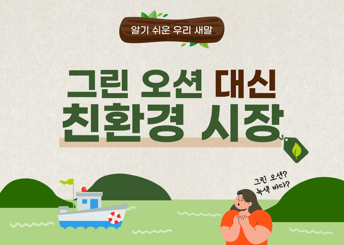 영어에서 ‘친환경’은 ‘에코-프렌들리(eco-friendly)’ 혹은 말머리에 ‘에코’만을 붙여 표현하지만 ‘그린’ 역시 보편적으로 쓰인다. 친환경 단체로 유명한 ‘그린 피스’나 ‘친환경 에너지원’을 뜻하는 ‘그린 에너지’ 등이 익숙한 표현이다. 그렇다면 ‘그린 오션’도 영어권에서 쓰이는 말일까. 답은 ‘그렇지 않다’. 영어권에서 ‘그린 오션’은 ‘녹색’이라는 단어의 원뜻 그대로 ‘녹색 바다’라는 뜻이다. 친환경과 관련된 뜻은 없다. 환경친화적 산업, 혹은 친환경 시장을 의미하는 ‘그린 오션’은 ‘국산 신조어’인 셈이다.