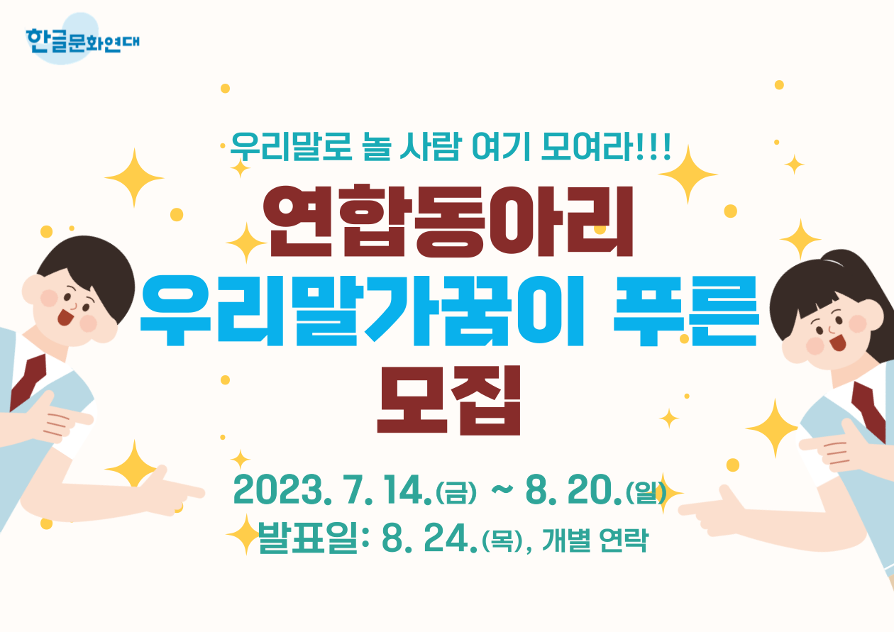 안녕하세요. 한글문화연대입니다 :) <우리말가꿈이 푸른 연합동아리>에 지원해 주셔서 감사합니다🎉 모집 기간: 2023년 7월 14일(금) ~ 8월 20일(일) 모집 인원: 00명 선정 발표: 2023년 8월 24일(목) 개