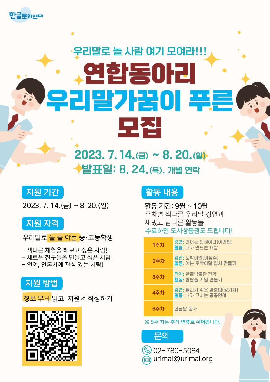 안녕하세요. 한글문화연대입니다 :) <우리말가꿈이 푸른 연합동아리>에 지원해 주셔서 감사합니다🎉 모집 기간: 2023년 7월 14일(금) ~ 8월 20일(일) 모집 인원: 00명 선정 발표: 2023년 8월 24일(목) 개