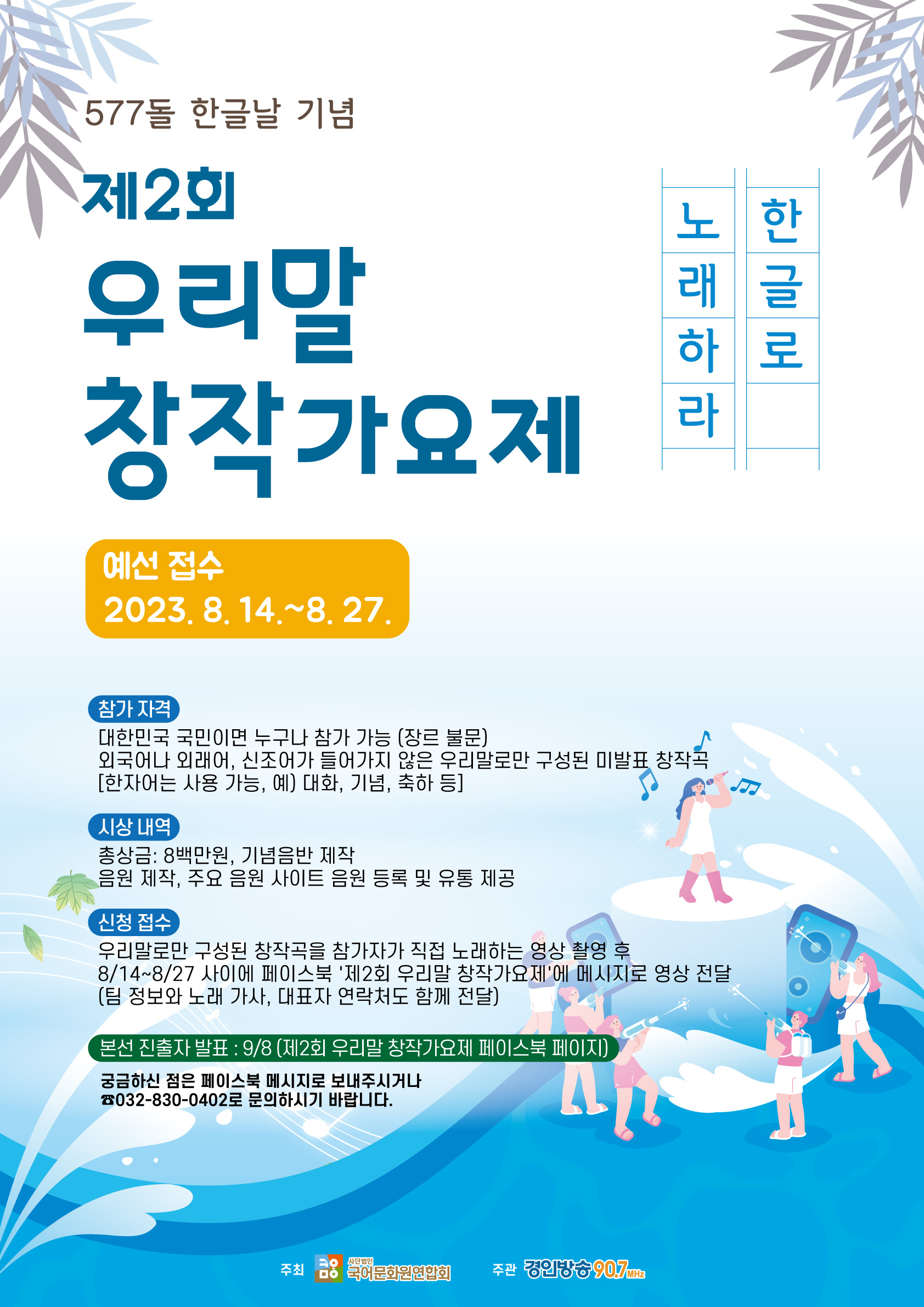577돌 한글날 기념 제2회 우리말 창작 가요제에서 참가자를 모집합니다.