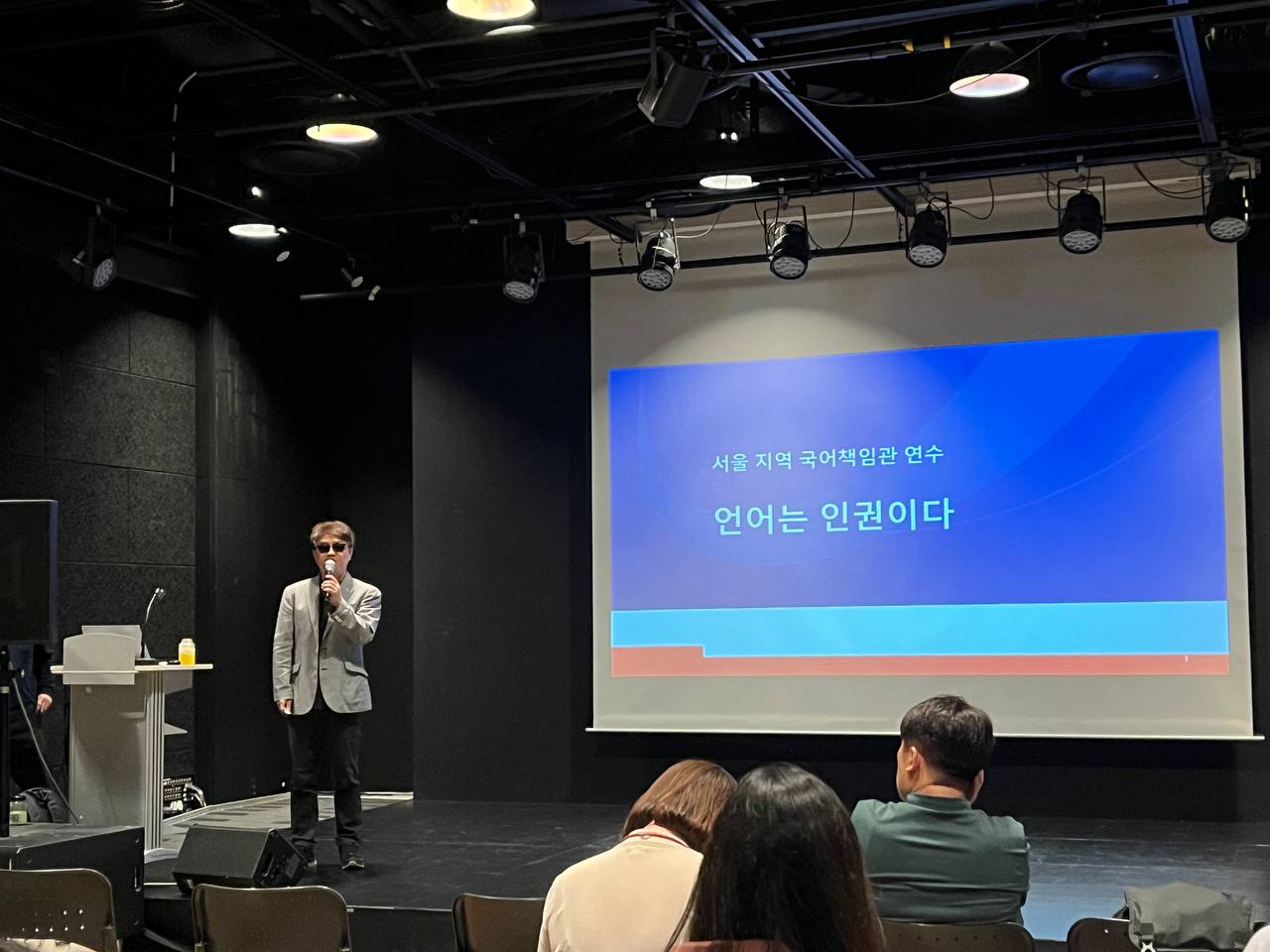 연수회는 ▲국민의례/여는 말 ▲국어책임관의 역할과 방향 (신능호 국어전문관) ▲차별어 없는 세상 만들기 (김슬옹 세종국어문화원 원장) ▲언어는 인권이다 (이건범 한글문화연대 국어문화원 원장) ▲다듬은 말 쓰기와 올바른 공문서 작성법 (한은주 이화여대 국어문화원 선임연구원) ▲닫는 말/기념사진 촬영 순으로 진행됐습니다.