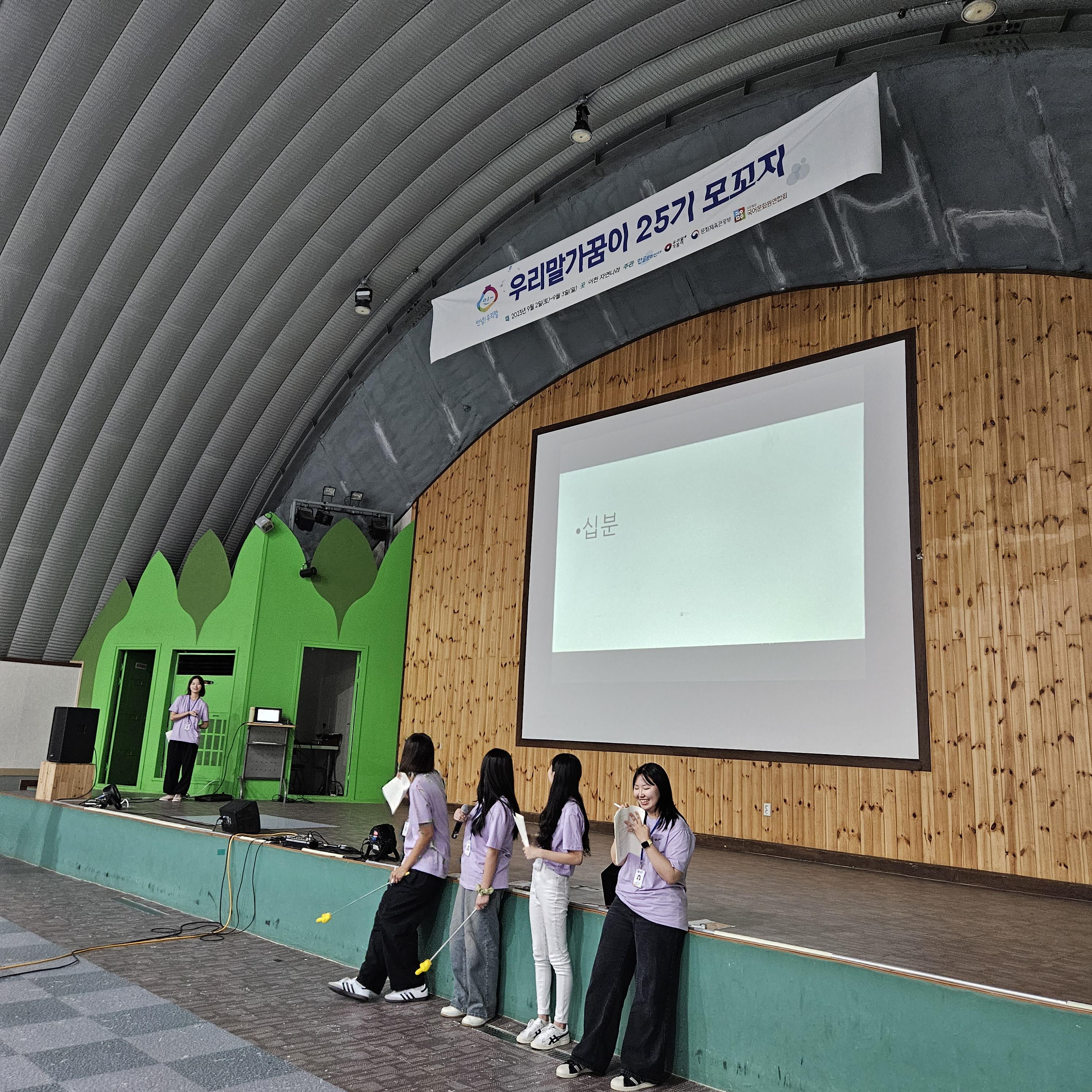 25기 모꼬지 장소는 경기도 이천의 '자연나라 수련원' 입니다! 점심 식사를 마친 후 대강당에 모여 우리말가꿈이 활동 안내를 신수호 지도위원이 설명해 주었고 우리말가꿈이 16, 17, 18, 23기를 했었던 김지연 선배님이 가꿈이 활동을 하면서 느낌 점과 후배 가꿈이들에게 조언을 해주었습니다.