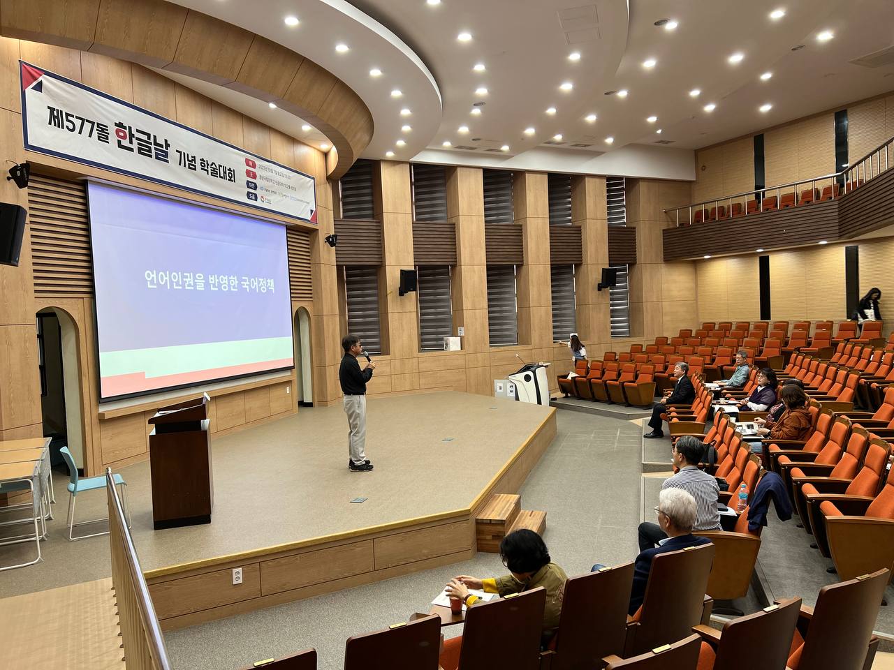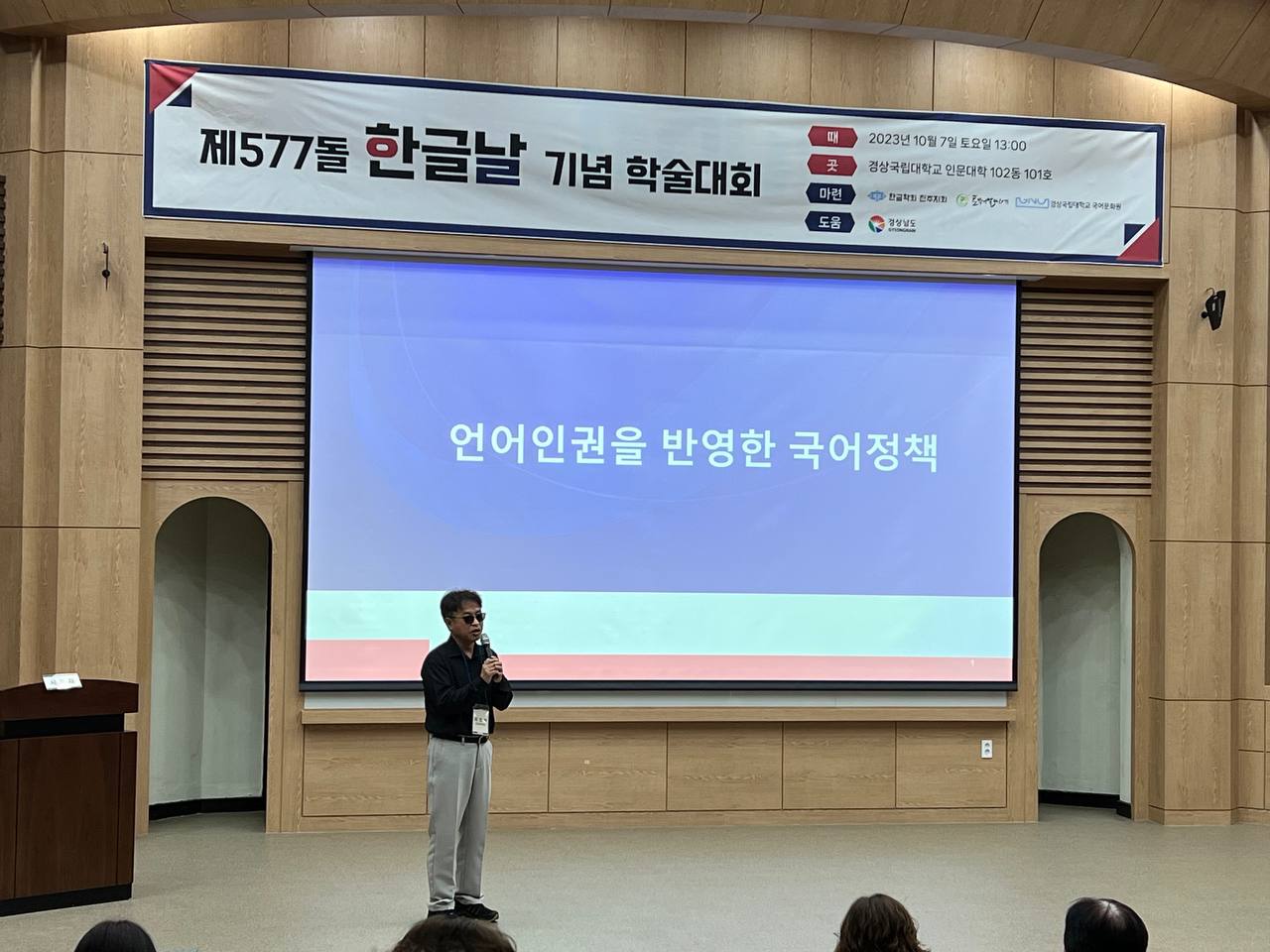 2023년 10월 7일, 경상국립대학교 인문대학에서 열린 '제577돌 한글날 기념 학술대회'에 한글문화연대 이건범 대표, 김명진 부대표가 다녀왔습니다.