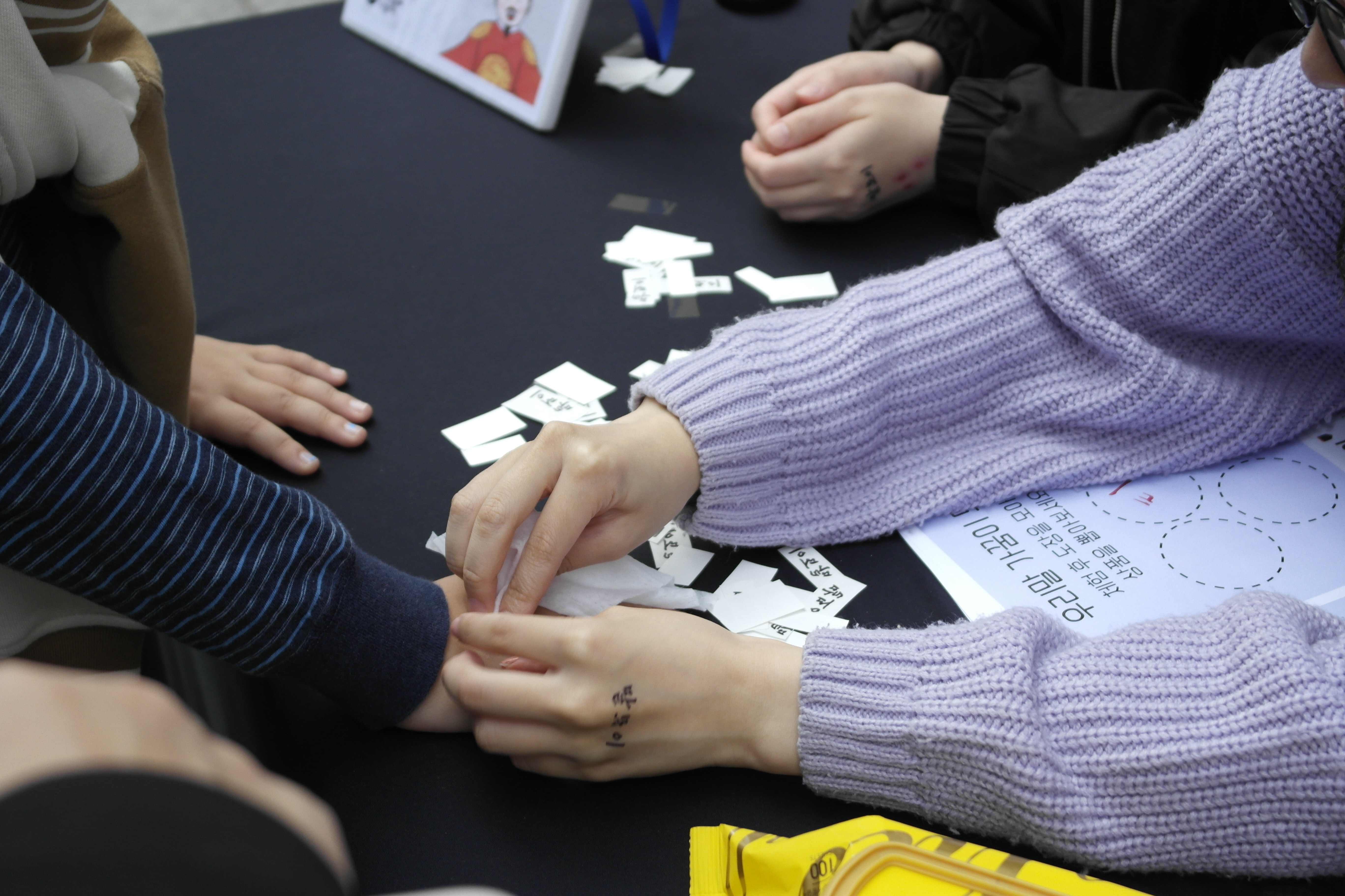 다음은 우리말 타투 스티커 체험입니다. 말모이라는 단어와 무궁화 스티커를 물휴지를 이용해 원하는 부위에 붙여 줬습니다! 아쉽게도 하루밖에 진행하지 못했죠... ㅜ 다음 날인 한글날에는 한글 팔찌 만들기와 복조리 만들기로 대체했습니다!