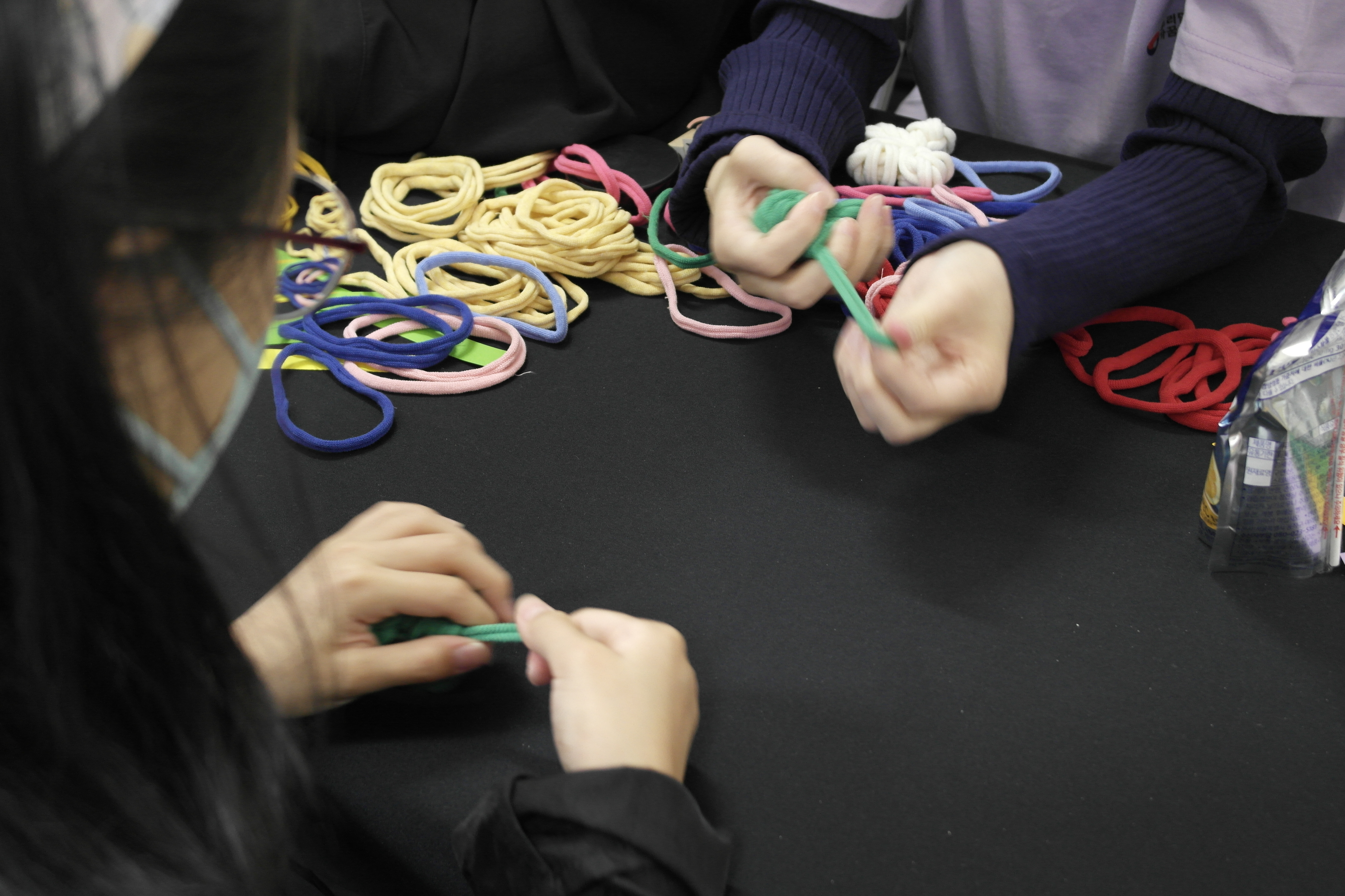 첫 번째는 양말목을 활용한 소품 만들기입니다. 양말목으로 네잎클로버, 꽃 열쇠고리나 장식품을 만들고 우리말 덕담이 적힌 쪽지를 줬습니다!