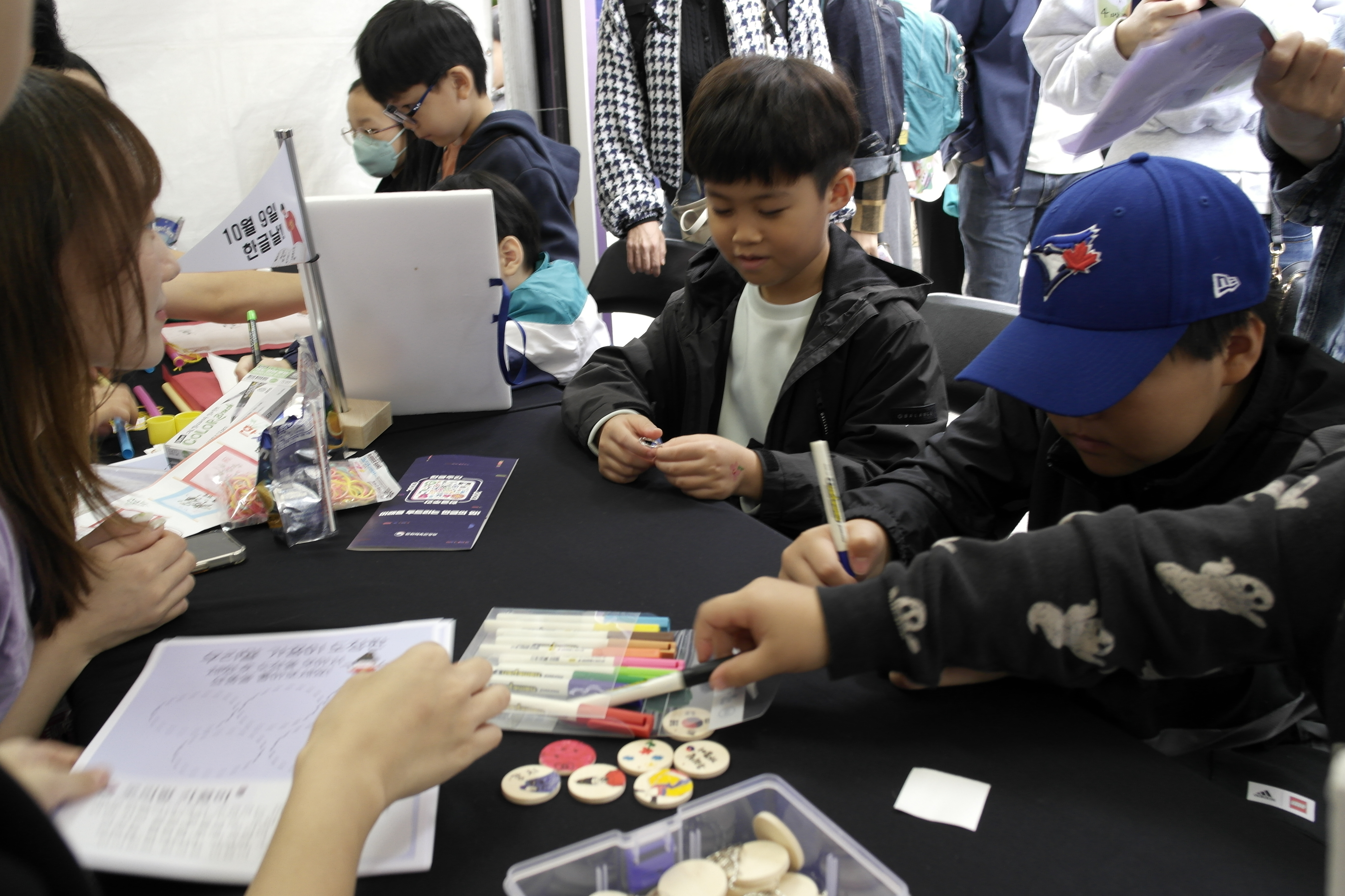 네 다음은 족자 만들기 체험입니다! 한지로 된 족자를 펼쳐 원하는 문구를 적는 활동인데요! 인기가 너무 많아서 재료가 조기 소진되었습니다!