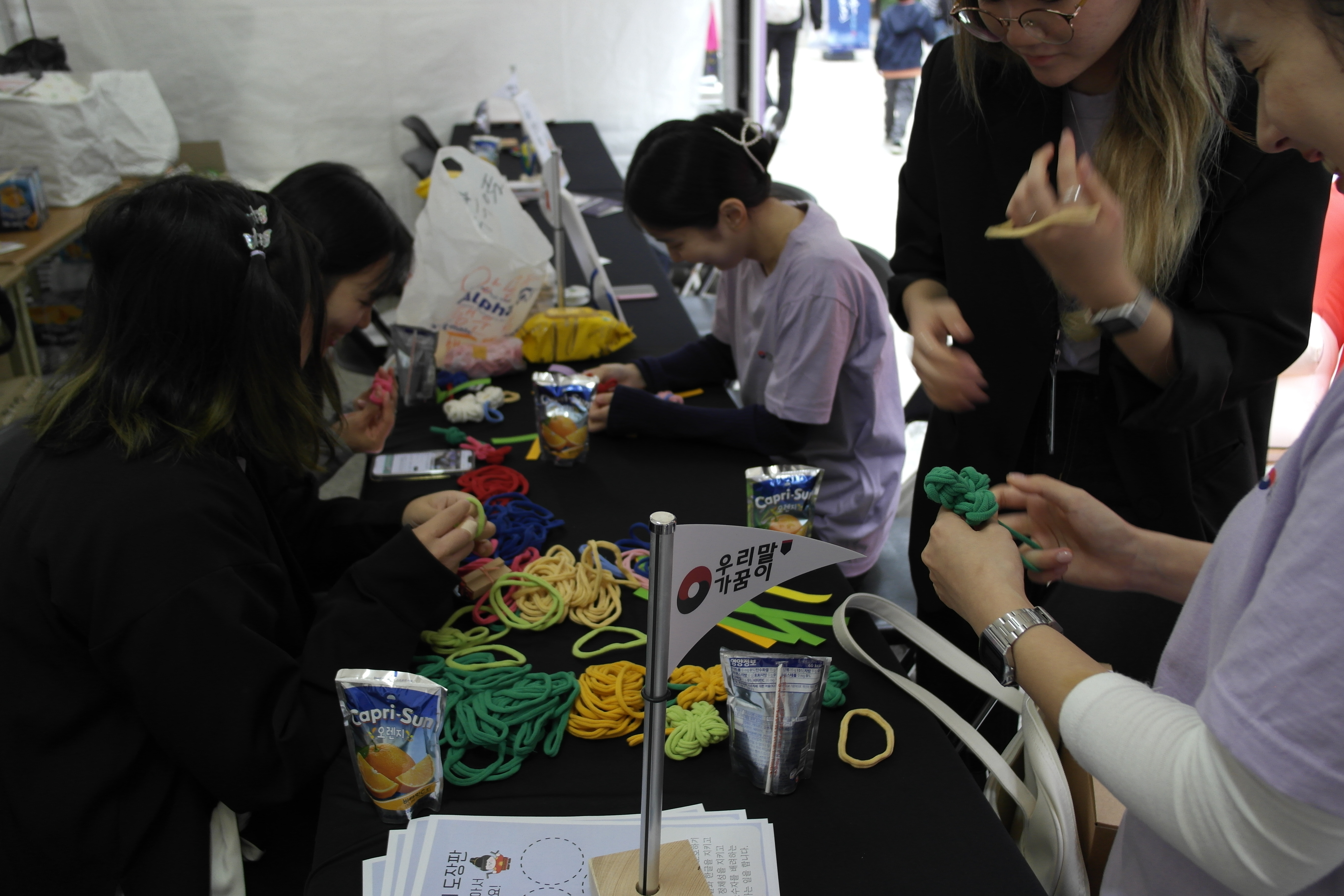 첫 번째는 양말목을 활용한 소품 만들기입니다. 양말목으로 네잎클로버, 꽃 열쇠고리나 장식품을 만들고 우리말 덕담이 적힌 쪽지를 줬습니다!