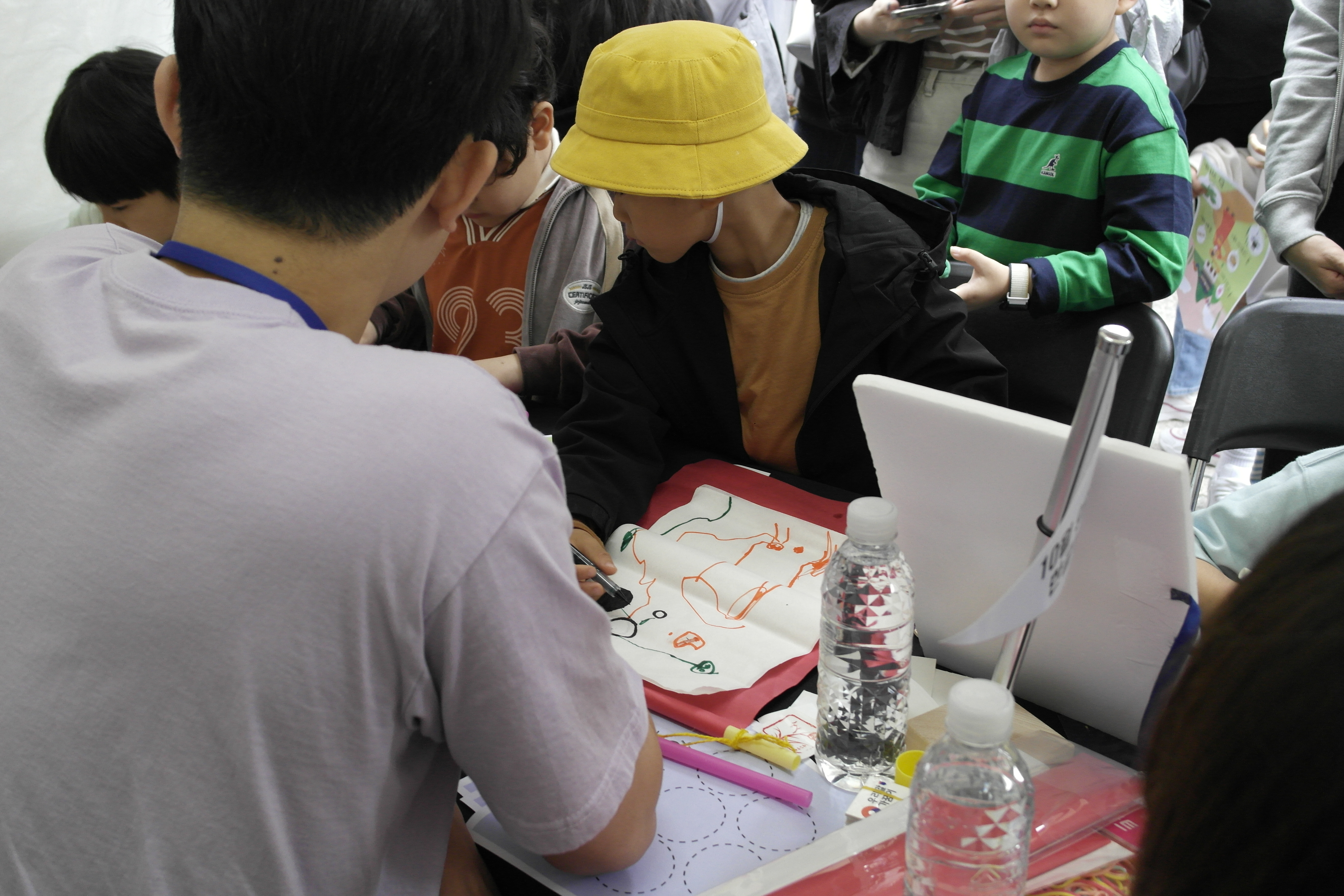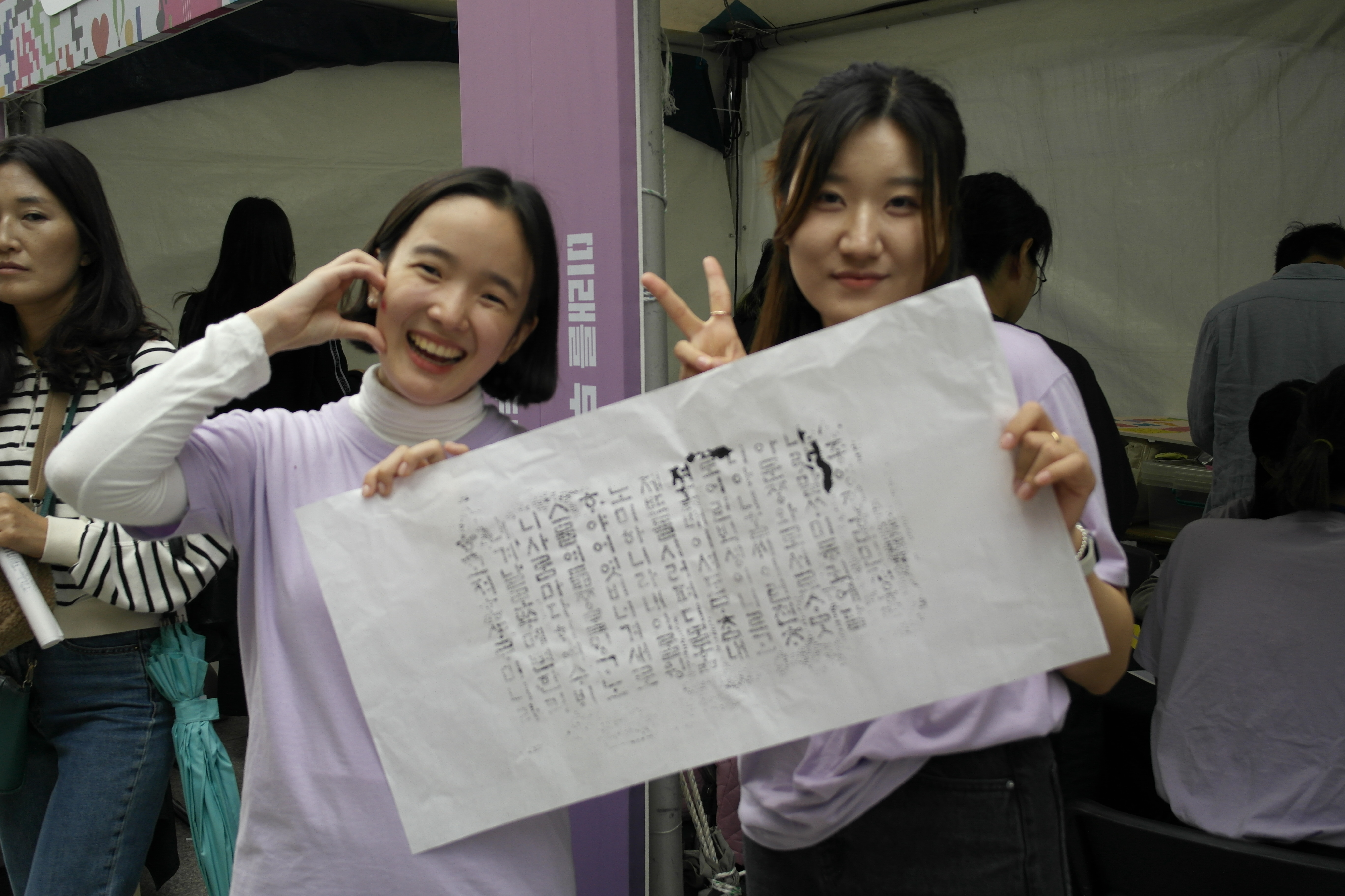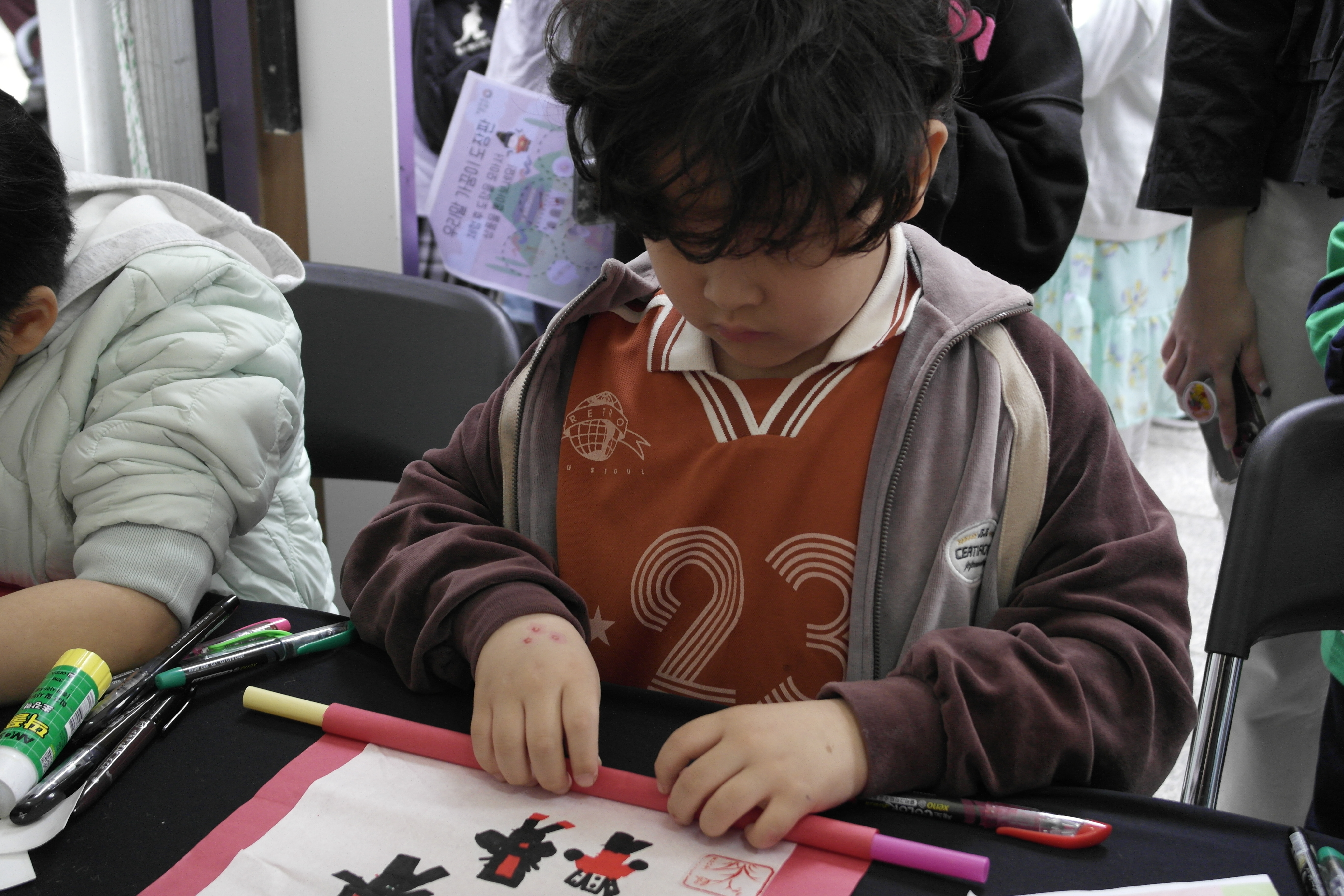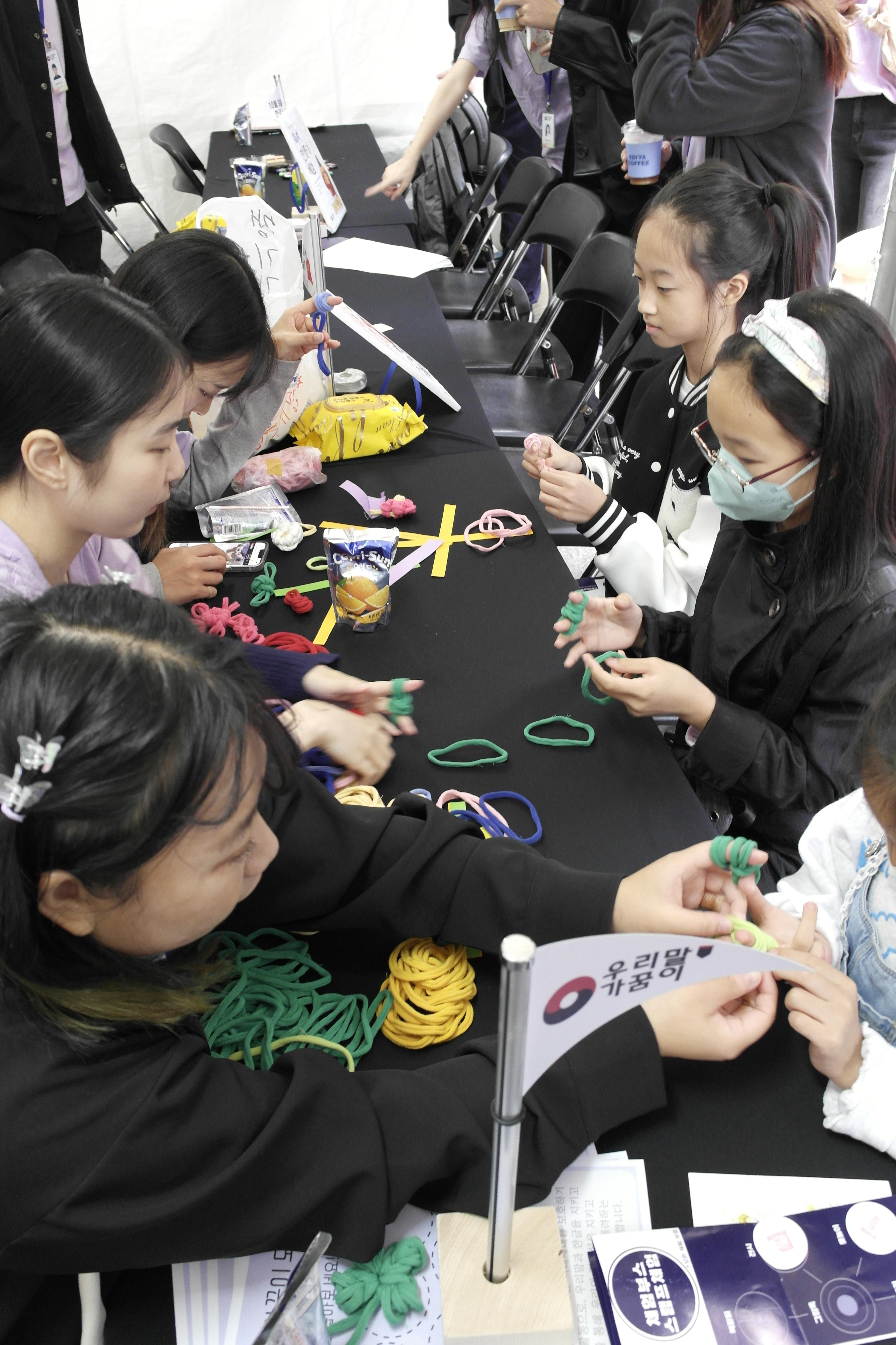 네 다음은 족자 만들기 체험입니다! 한지로 된 족자를 펼쳐 원하는 문구를 적는 활동인데요! 인기가 너무 많아서 재료가 조기 소진되었습니다!