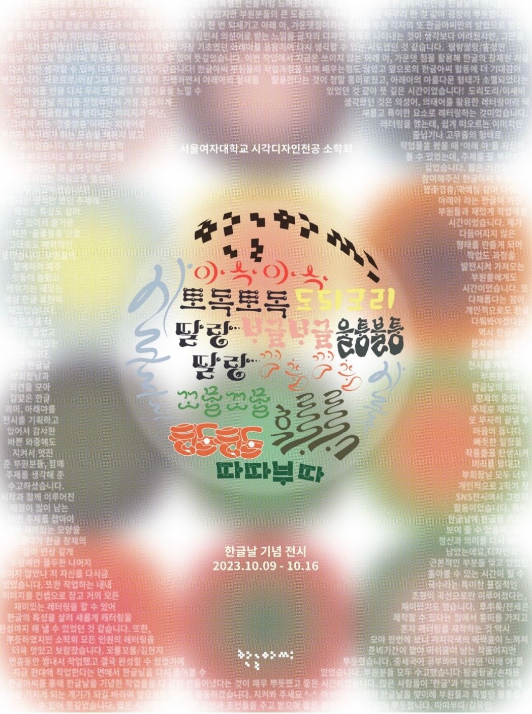 지난 10월 9일 한글날을 맞이하여 서울여대의 한글아씨가 온라인 전시회를 열었다. 한글아씨는 한글 아이디어 씨앗의 줄임말로, 한글의 깊이 있는 발전을 지향하며 한글꼴을 연구하는 글자 만듦 소학회다. 한글날마다 전시회를 해온 한글아씨는 올해도 어김없이 전시를 열었다. 한글에 남다른 애정을 가진 한글아씨의 학회장(전세은 씨)과 부학회장(김민서 씨)을 만나 이야기를 들어보았다.