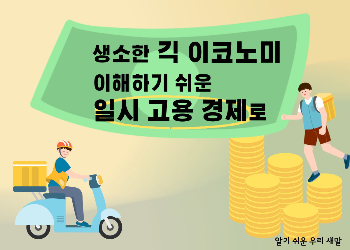 신조어는 ‘새로 생겨난 말’을 가리키지만, 구성 방법을 보면 크게 두 가지로 나눌 수 있다. 원래 많이 쓰던 단어를 둘 이상 결합해서 새로운 의미를 보태 쓰는 방법이 그 하나라면, 다른 하나는 쓰기 시작한 지 비교적 오래되지 않은 단어를 새로 ‘발굴’해 요즘의 세태에 맞춰 활용하는 것이다. 지난 몇 차례에 걸쳐 살펴본 ‘아트 테크’, ‘퍼스널 컬러’, ‘블루 푸드’가 전자(단어 각각의 뜻을 보고 전체 용어의 의미를 짐작할 수 있다)에 해당하고, 오늘 살펴볼 ‘긱 이코노미(gig economy)’는 후자에 속한다.