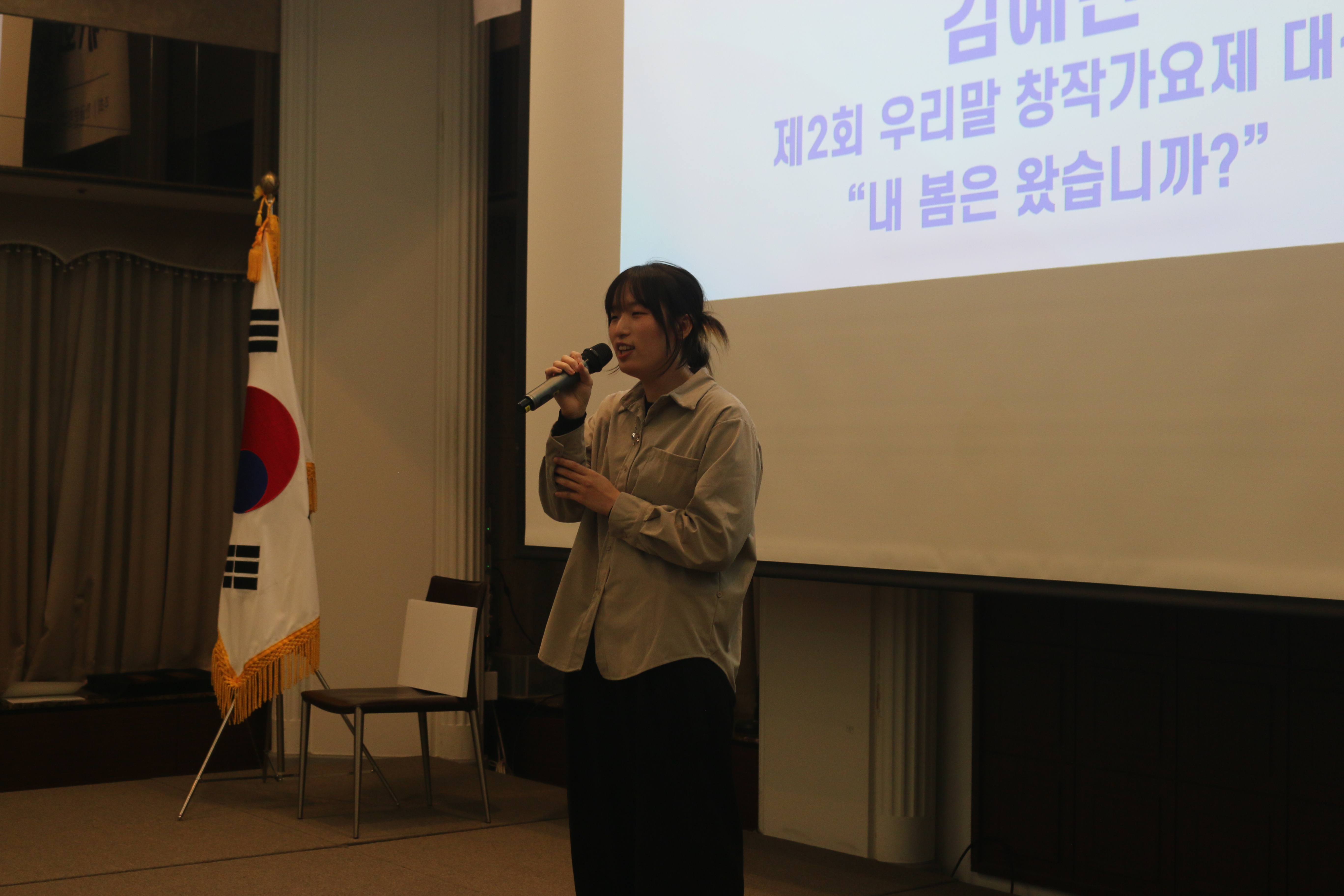 다음 식순은 사단법인 국어문화원연합회에서 주관한 제2회 우리말 창작가요제에서 대상을 받은 김예빈 님의 축하 공연이 진행되었습니다. 김예빈 님은 우리말 가사로 구성된 <"내 봄은 왔습니까?">라는 노래로 시상식장에 있는 사람들의 심금을 울렸습니다.