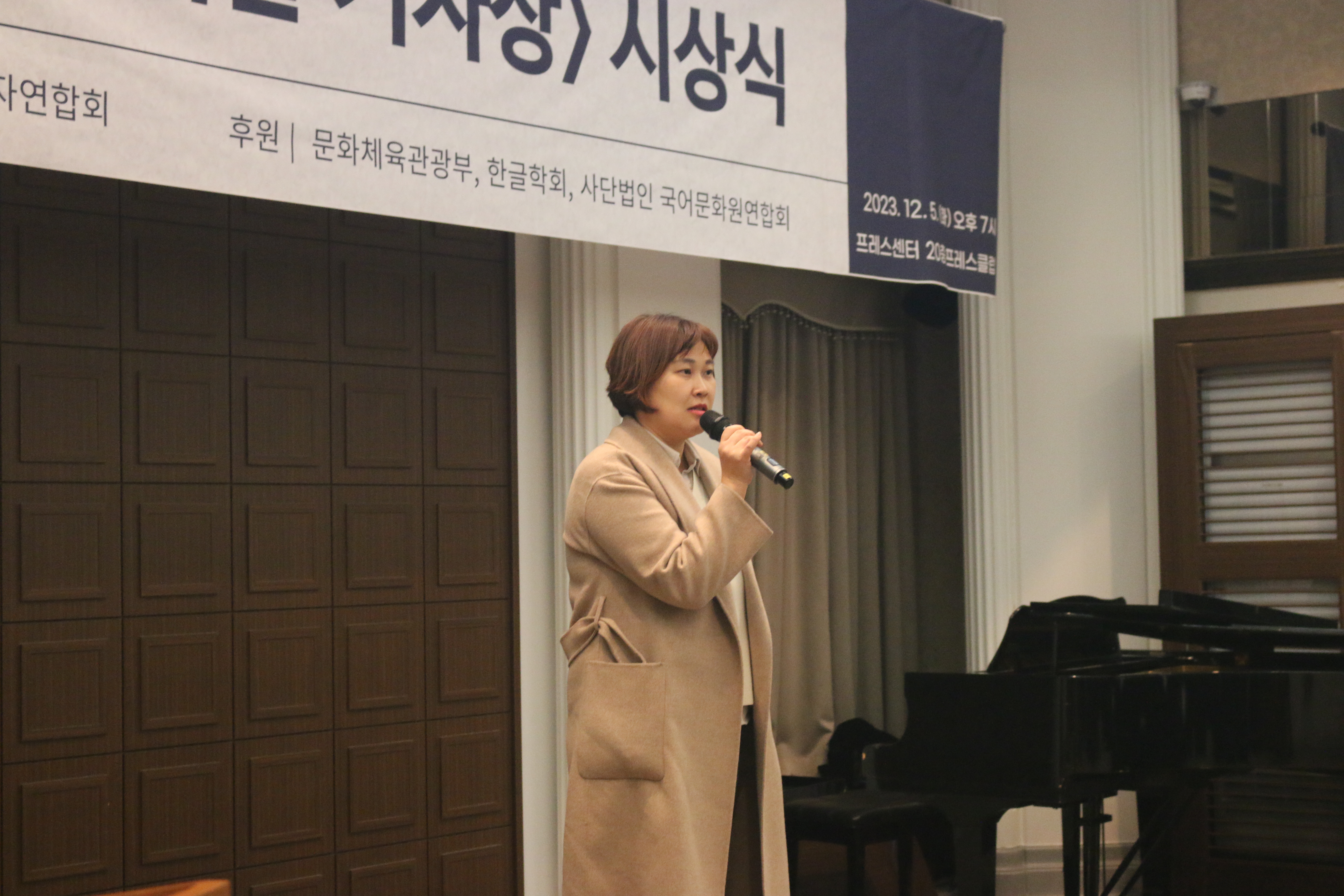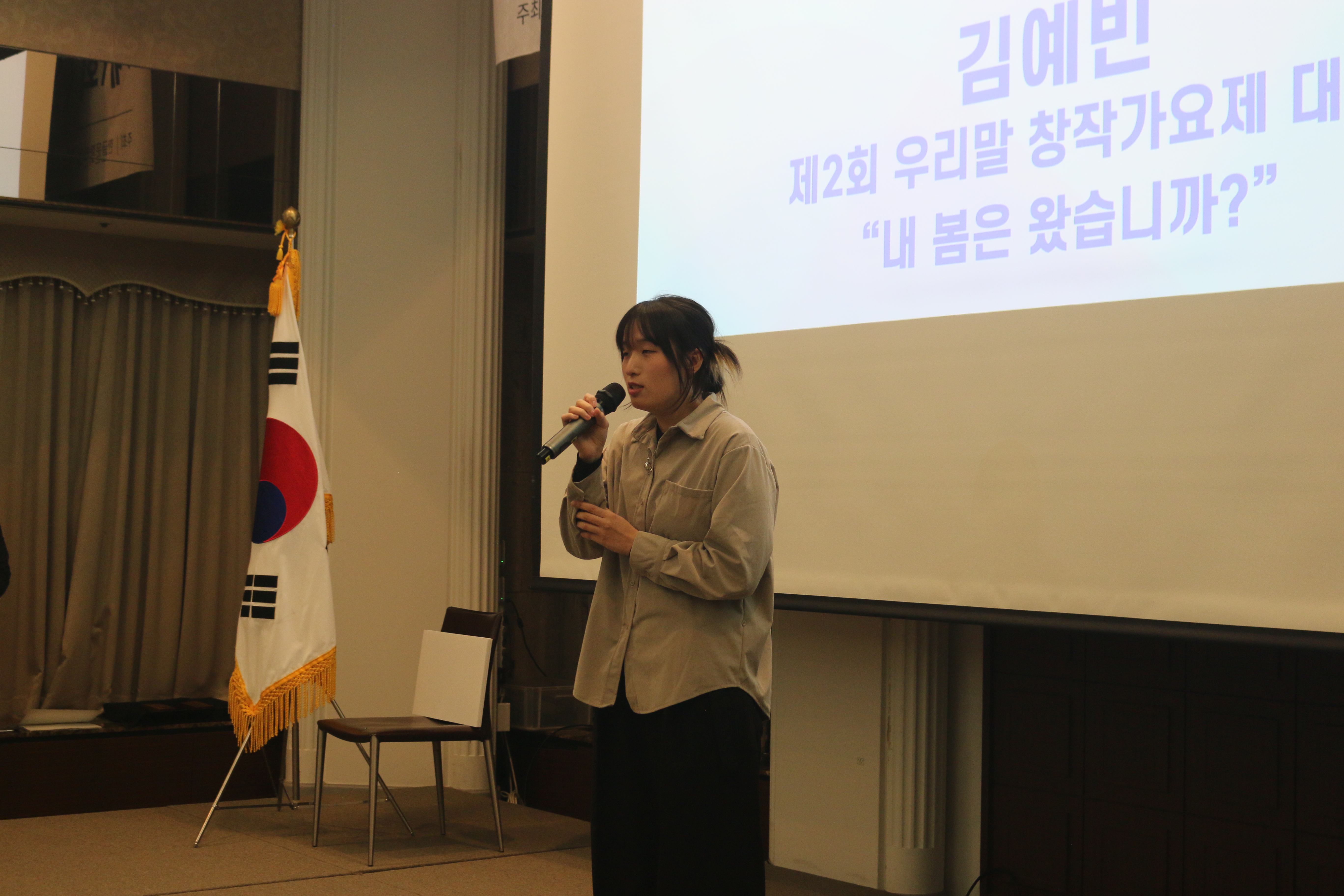 다음 식순은 사단법인 국어문화원연합회에서 주관한 제2회 우리말 창작가요제에서 대상을 받은 김예빈 님의 축하 공연이 진행되었습니다. 김예빈 님은 우리말 가사로 구성된 <"내 봄은 왔습니까?">라는 노래로 시상식장에 있는 사람들의 심금을 울렸습니다.