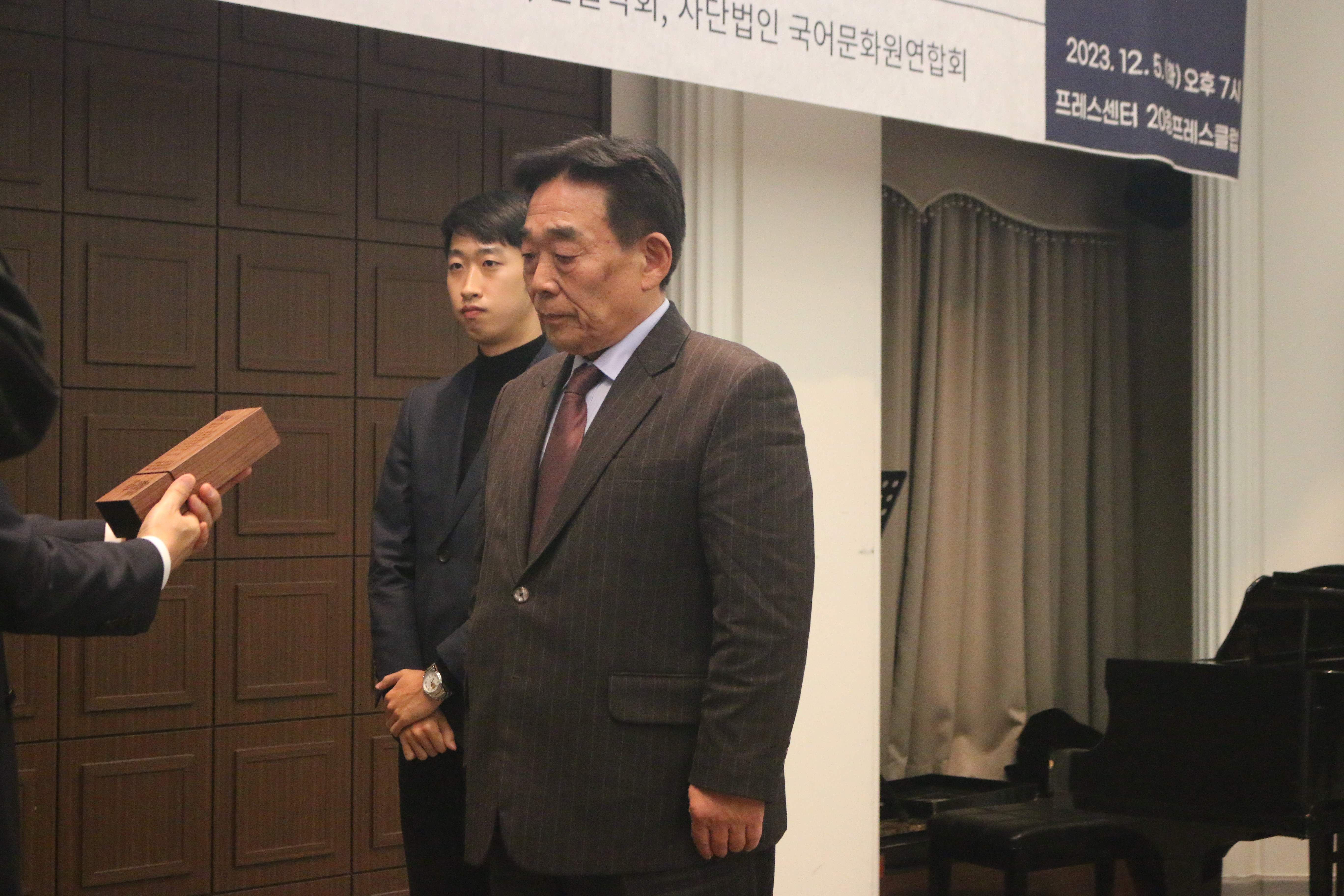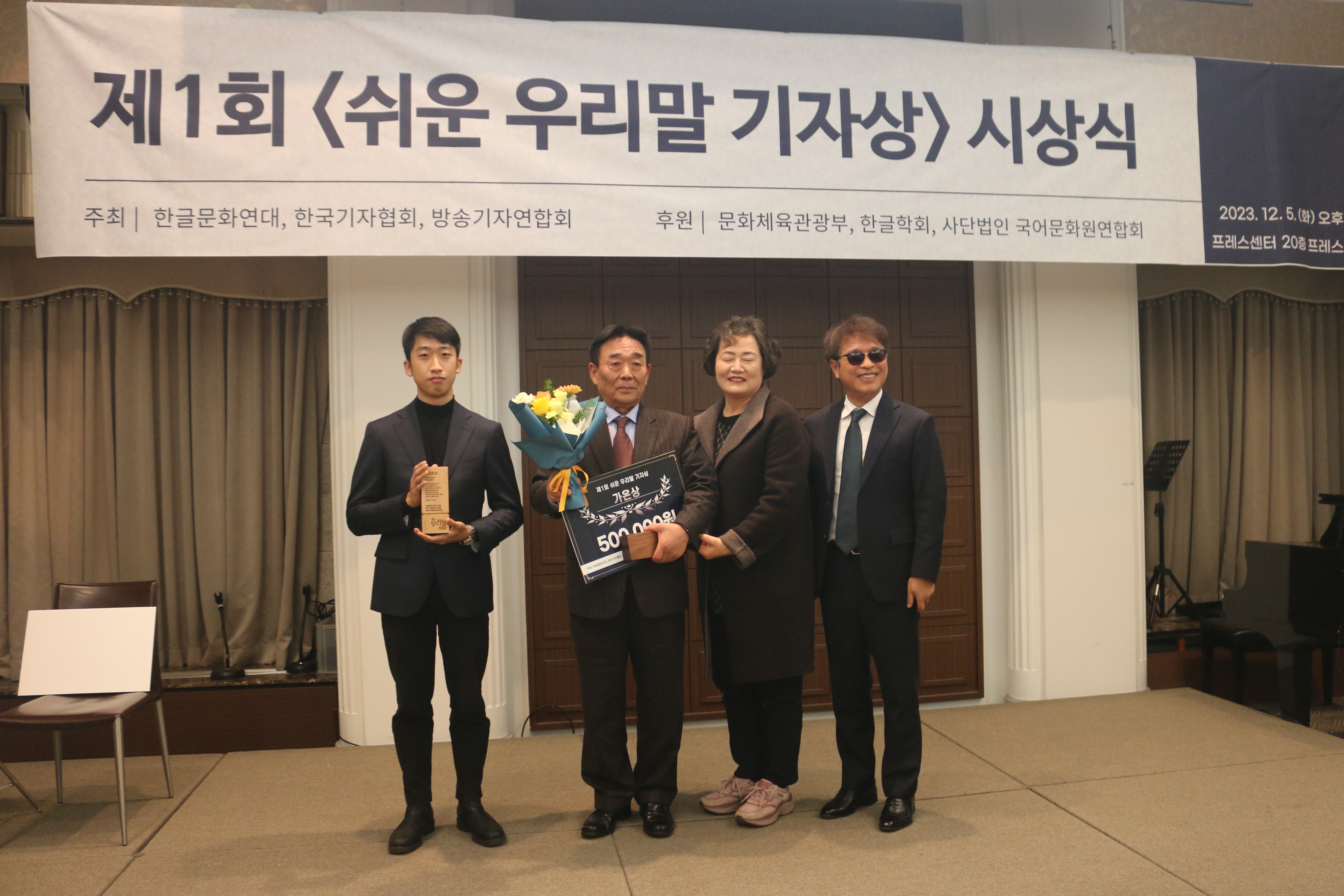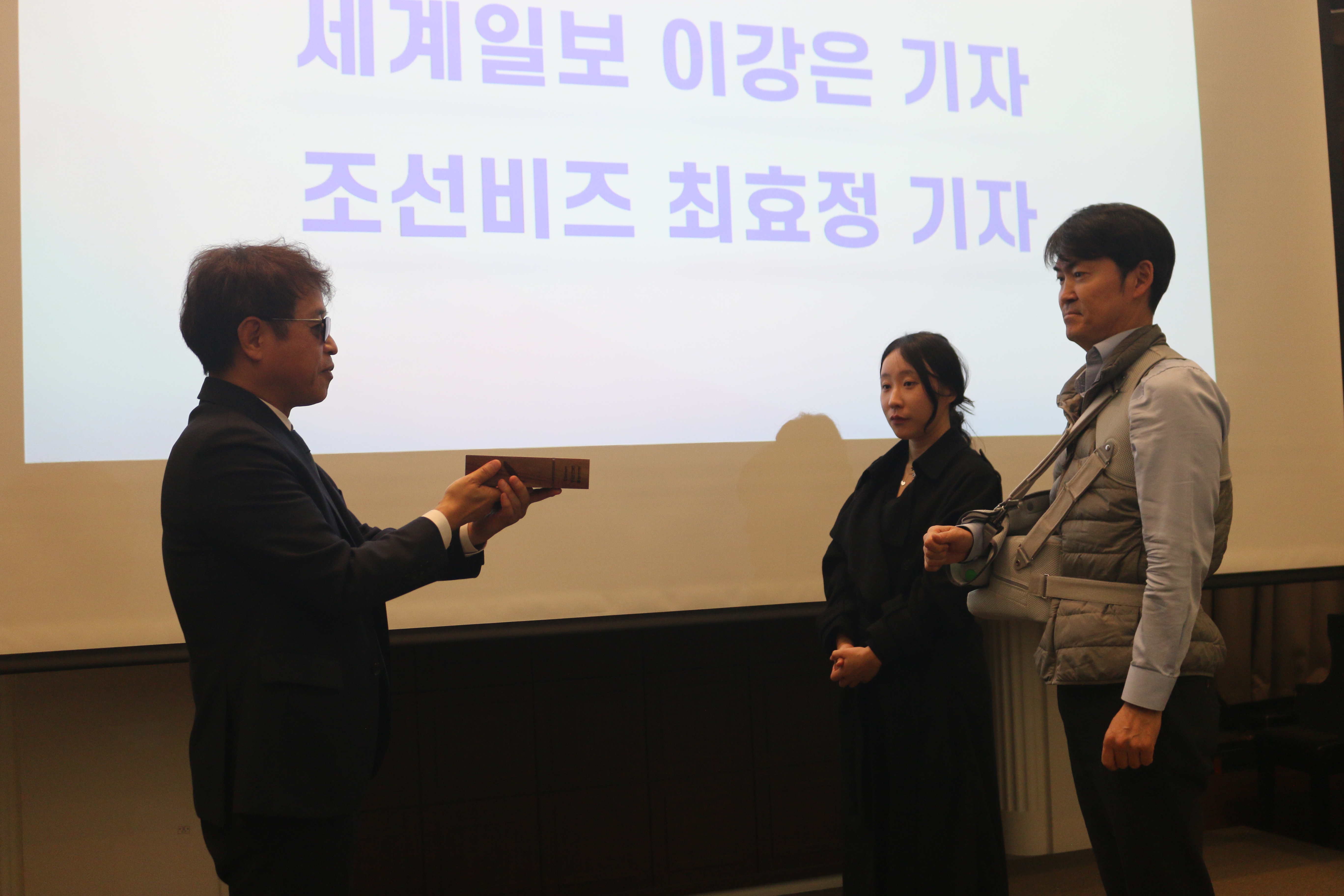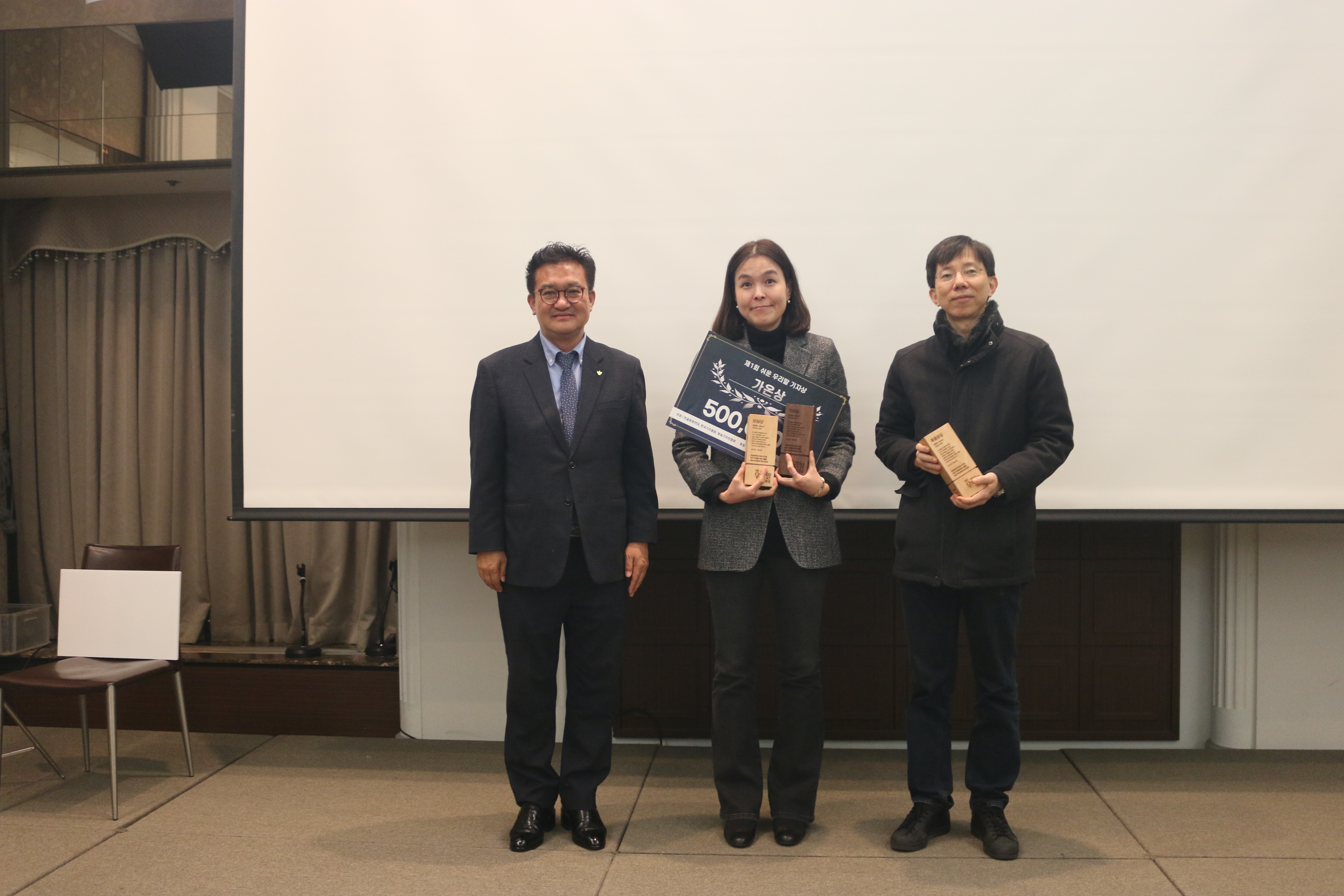 이어 본격적인 시상식에 앞서 그동안 쉬운 우리말 기사 쓰기를 위해 노력해 오신 기자분께 감사패를 전달했습니다. 한글문화연대 이건범 대표님이 시상을 맡았으며, 세계일보 이강은 기자님과 조선비즈 최효정 기자님이 감사패를 받았습니다.