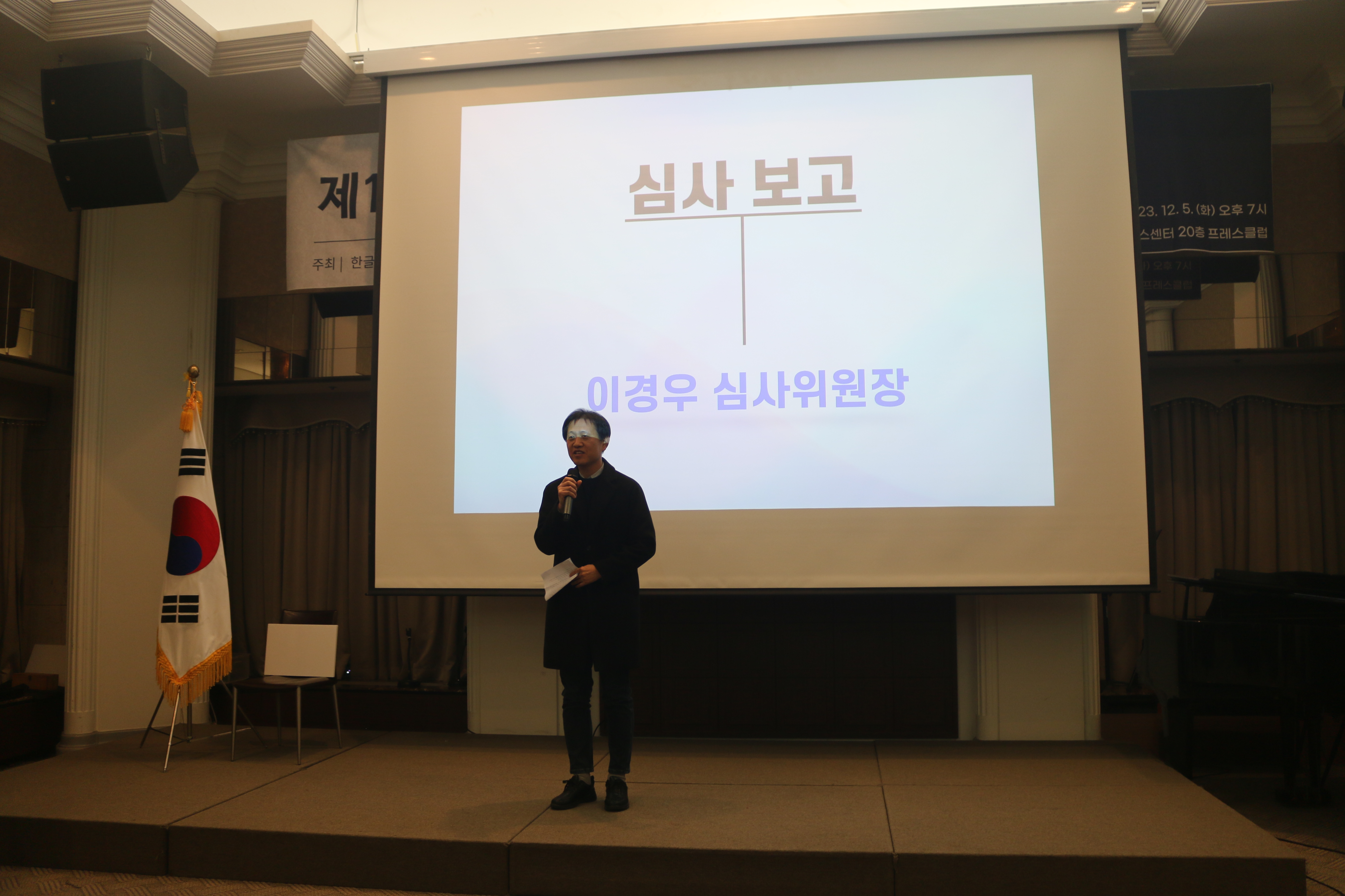 김예빈 님의 축하 공연 후, 이경우 심사위원장님의 심사 보고가 진행되었습니다. 이경우 심사위원장은 온라인 기사의 발행 과정을 고려하며 후보자가 쉬운 우리말로 기사를 작성하기 위한 의지를 보았다고 전했습니다.