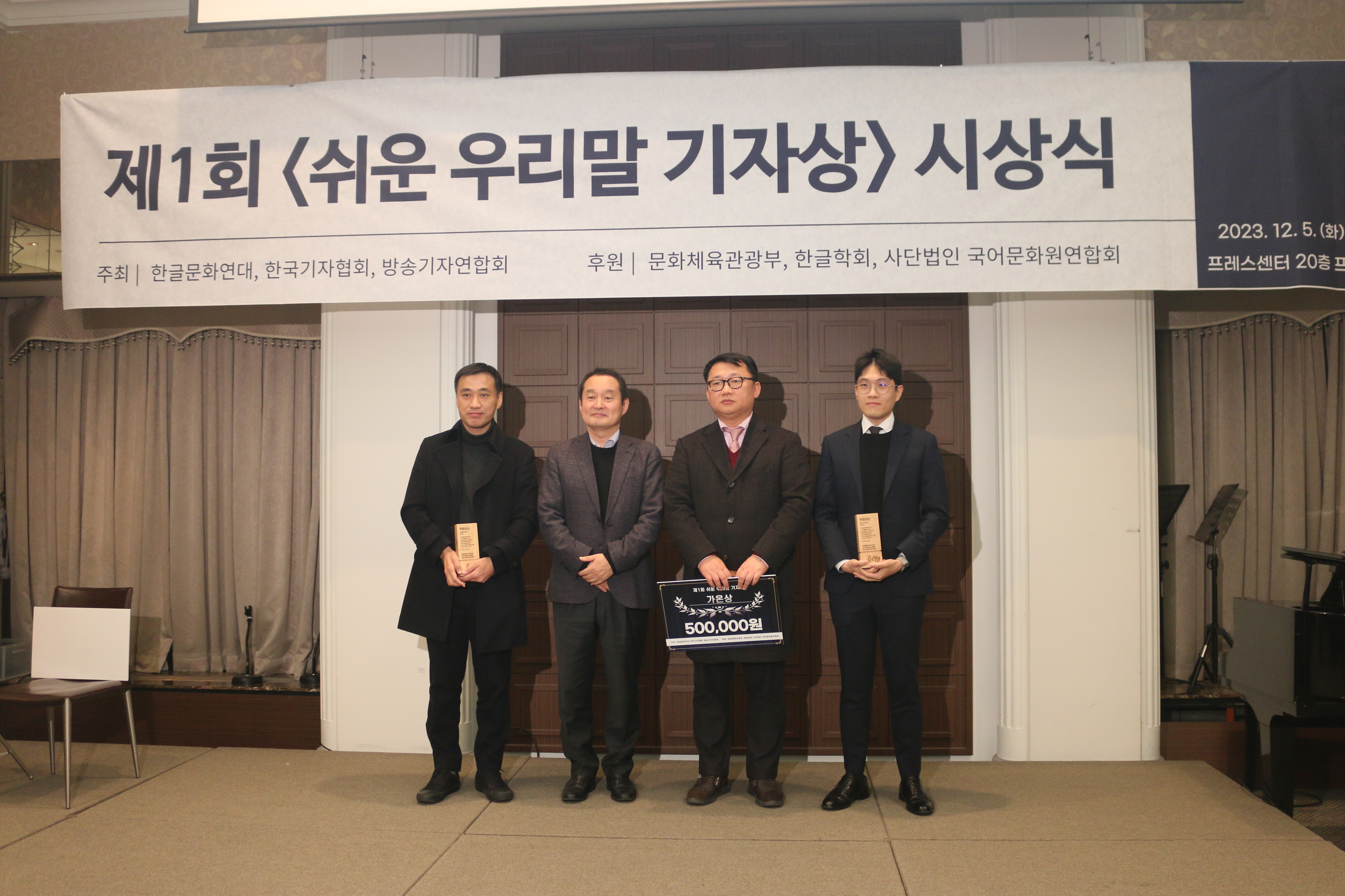 한글문화연대는 기자들이 쉬운 우리말 기사를 쓰도록 장려하기 위해 제1회 <쉬운 우리말 기자상> 시상식을 열었습니다. 이번 시상식은 한글문화연대, 한국기자협회, 방송기자연합회가 공동 주최하였고, 문화체육관광부, 한글학회, 사단법인 국어문화원연합회가 후원하였습니다.