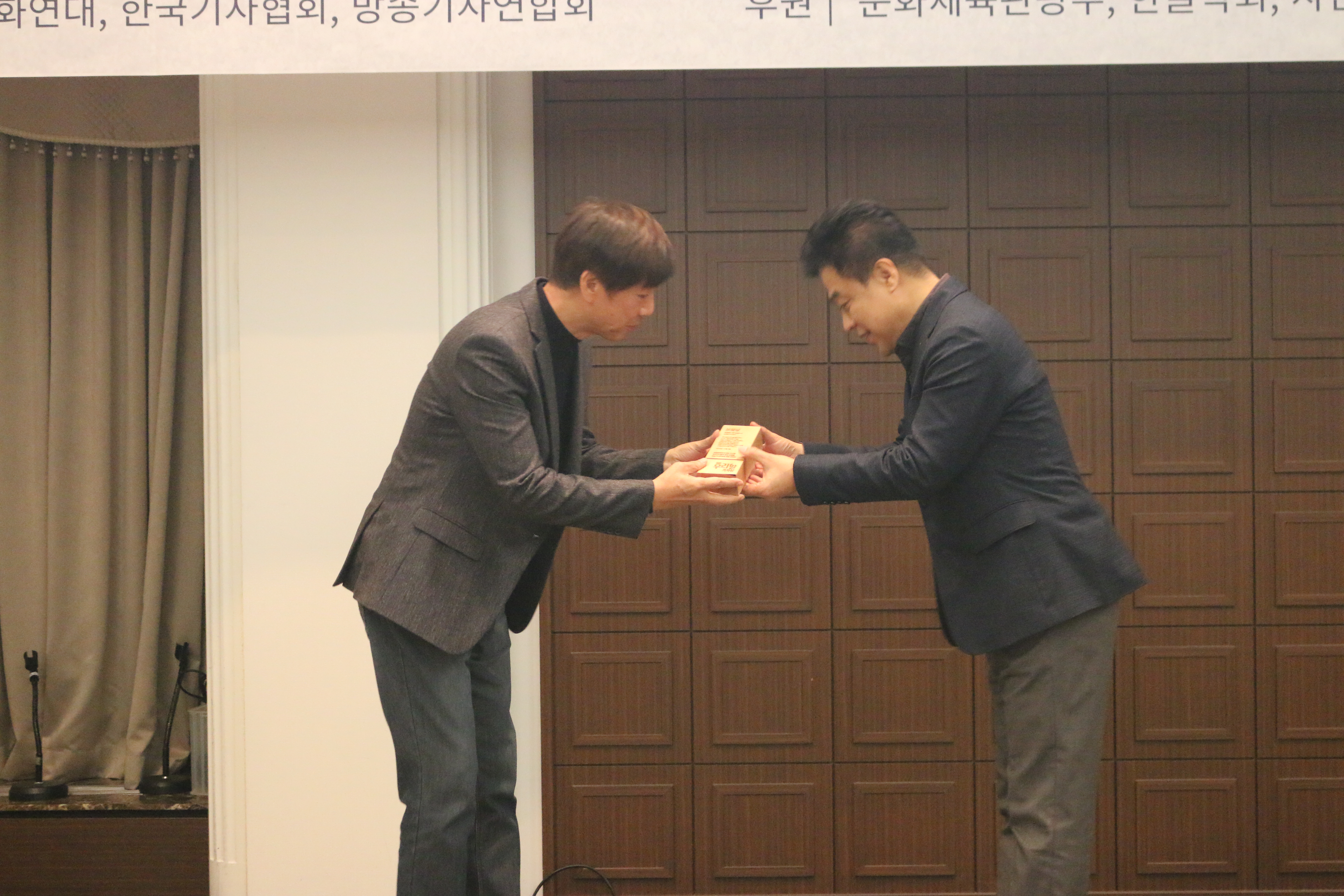 방송 분야는 방송기자연합회 양만희 회장님께서 시상을 맡아주셨습니다. 1등 <가온상>은 와이티엔(YTN) 김종호 기자님, 장려 <북돋음상>은 와이티엔(YTN) 홍민기 기자님이 수상했습니다. 2등 <보람상> 케이비에스(KBS) 손원혁 기자님과 장려 <북돋음상> 케이비에스(KBS) 노준철 기자님께서는 부득이한 사정으로 참석하지 못하셨습니다.