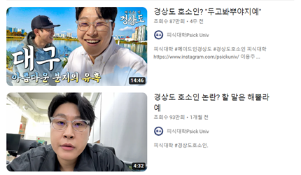 지난 10월부터 ‘피식대학’에 올라오기 시작한 영상 주제는 ‘메이드 인 경상도’이다. 출연진들은 경상도 지역을 돌아다니며 사투리를 사용한다. 이용주(출연자)는 부산 출생이지만 실제로 부산에 거주한 것은 몇 년 되지 않아 엉터리 사투리를 사용하고, 김민수(출연자)는 울산 출신으로 경상도 사투리를 제대로 구사해 그 대비로 시청자들에게 웃음을 주고 있다. 또 다른 예로 ‘스튜디오 유니코’라는 유튜브에서는 희극인 김두영이 충청도 사투리 강의를 진행하며 일명 ‘돌려말하기’ 화법으로 불리는 충청도 사투리를 이용해 인기를 끌고 있다. 사투리는 그 지역만의 특색과 개성이 담긴 언어문화이다. 표준어가 사투리보다 더 고급스럽고 교양 있는 언어이며 사투리는 촌스럽다는 생각은 언어문화의 다양성을 해치고 지역 문화의 보존을 어렵게 만든다. 언어는 사용하는 사람의 심리와 문화, 역사 등 다양한 요소들을 담고 있기에 지역 언어인 사투리에서는 그 지역 사람들의 역사와 전통을 오롯이 느낄 수 있다. 물론 우리는 의사소통을 목적으로 말을 하므로 표준어를 사용하는 것은 중요하다. 그렇다고 해서 사투리가 배척되고 없어진다면 이는 우리 문화의 커다란 한 부분을 잃는 것이나 다름없다.