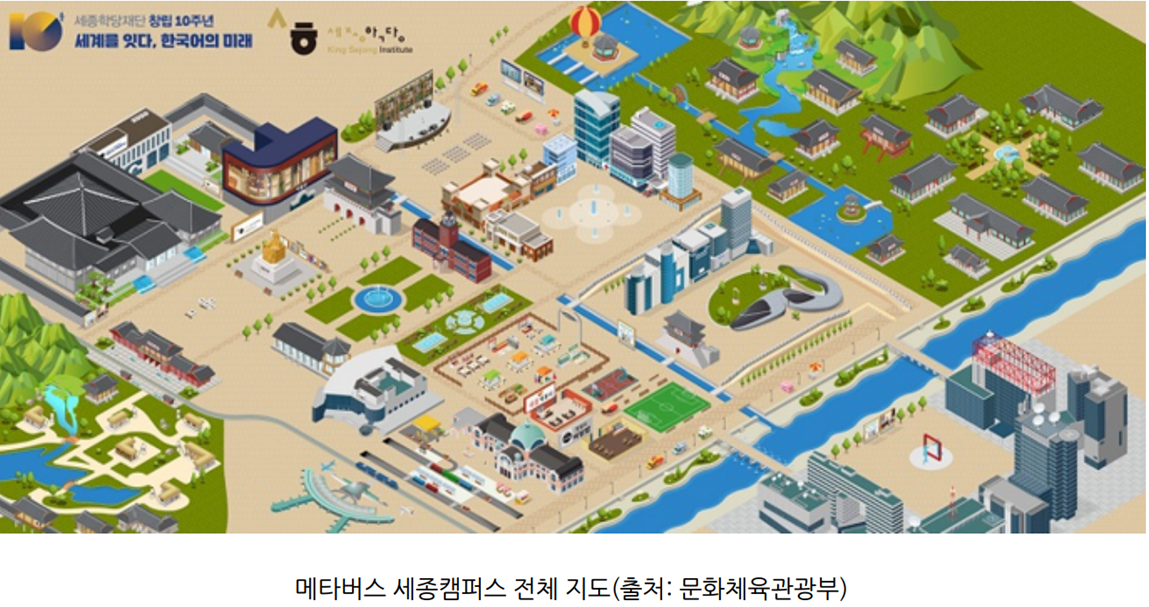 메타버스를 한국어 교육에 활용한 사례가 있다. 바로 ‘세종학당’이다. 세종학당은 국외 한국어 교육과 한국문화 보급 사업을 총괄하 기 위해 설립된 문화체육관광부 산하 공공기관이다. 외국인에게 한국어와 한국 문화를 알리기 위해 설립되었다. 지난해 6월 기준 84 개국 244개소가 운영되고 있는데 그 수는 계속 증가하고 있다. 드라마나 케이팝 등 한국 문화가 확산되면서 한국어, 한국 문화에 대 한 수요도 증가했기 때문이다. ‘케이-콘텐츠’, 케이팝이 인기를 끌자 한국어 학습을 하는 외국인도 늘어났다. 한국어 강좌가 개설되고 한국어능력시험 응시자가 증가했으며 한국어가 대학에서 전공과목으로 채택되는 국가도 늘었다. 또한, 명품 브랜드에서 한글을 주제 로 한 제품을 출시하기도 했다. 전 세계에서 한국어 열풍이 불고 있는 것이다.