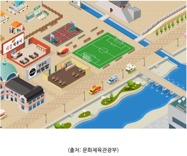 가상 세계의 세종학당에는 ‘캠퍼스 공간’과 ‘마을 공간’이 있다. ‘캠퍼스 공간’에는 한국어 수업이 진행되는 강의동과 ‘케이-문화’를 체 험할 수 있는 문화체험동, 대규모 행사가 열리는 행사동이 있다. ‘마을 공간’은 일상생활을 체험하면서 한국어 말하기 활동을 할 수 있 는 공간이다. 특히 이 공간에는 동대문디자인플라자(DDP), 서울역, 한강공원, 광장시장 등 한국의 대표적인 명소도 있어 외국인들의 한국 방문 욕구도 높일 수 있을 것 같다. 또한 각 공간은 현지 세종학당에서 실제로 활용하고 있는 기본 교재 '세종한국어 회화(재단 발 간)'의 학습 과정과 긴밀하게 연계해 구성하였다.