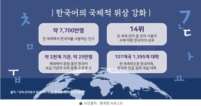 대한민국의 드라마, 영화 등이 온라인동영상서비스(OTT)를 통해 전 세계에 퍼지며 인기를 끌고 있다. 덕분에 한국어와 한글에 관심이 쏠 리고 있다. 특히 아카데미 4관왕에 빛난 영화 <기생충>과 한국의 전통 놀이를 알린 <오징어 게임>이 많은 관심과 사랑을 얻었다. 이같이 한국인과 한국 대중문화에 대한 높은 호감으로 시작해 한국어를 공부하는 사람들이 많아졌다. 전 세계적으로 한국어학, 한국학 전공 강좌 가 107개국 1,395개 대학에서 개설하였으며 약 2천 개 국외 기관에서 한국어 교육을 실시하고 있으며 등록 수강생 수는 약 25만 명에 달 한다. 한국어를 배우고자 하는 사람들이 증가하며 세계 속 한국어 바람이 불고 있음을 알 수 있다.