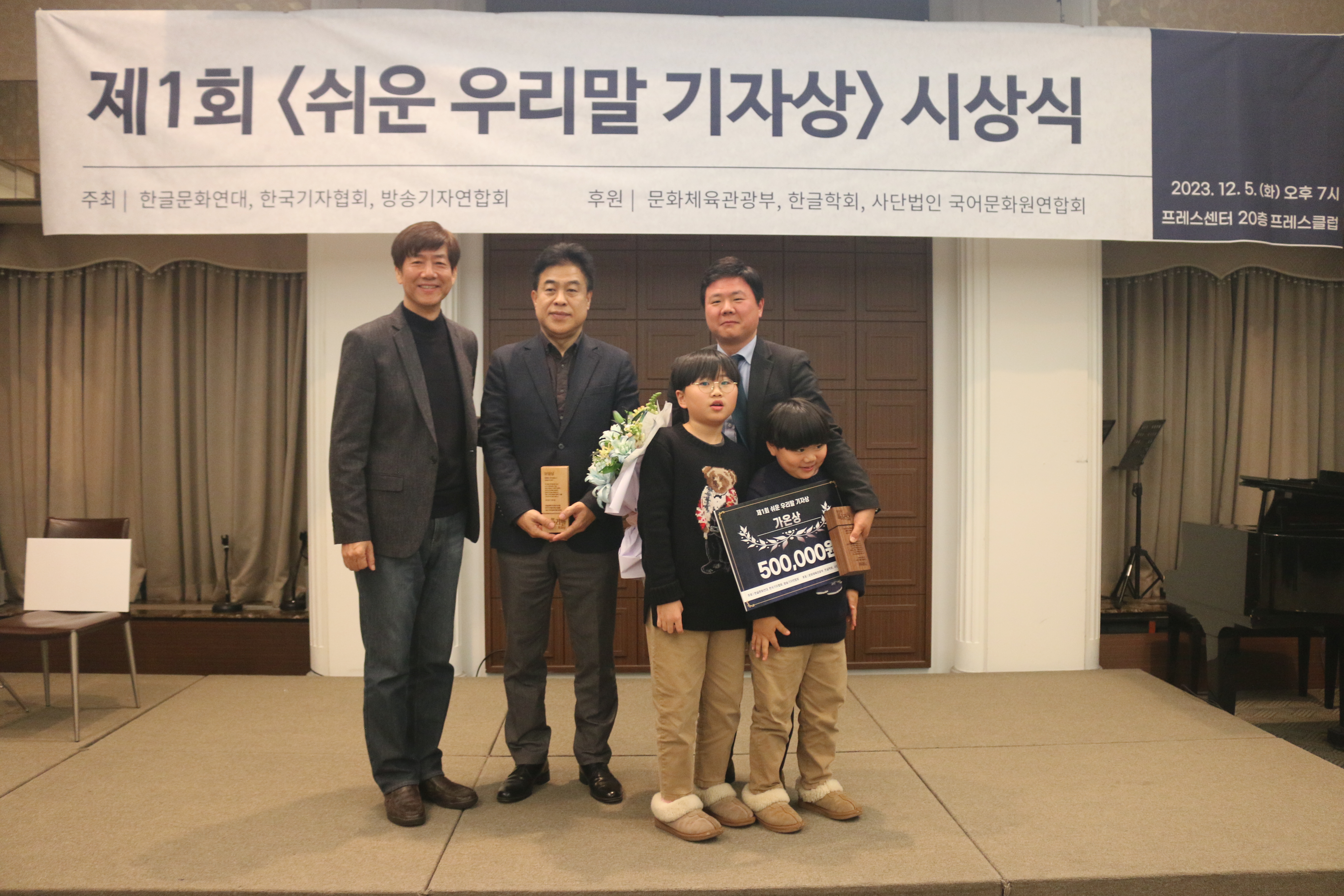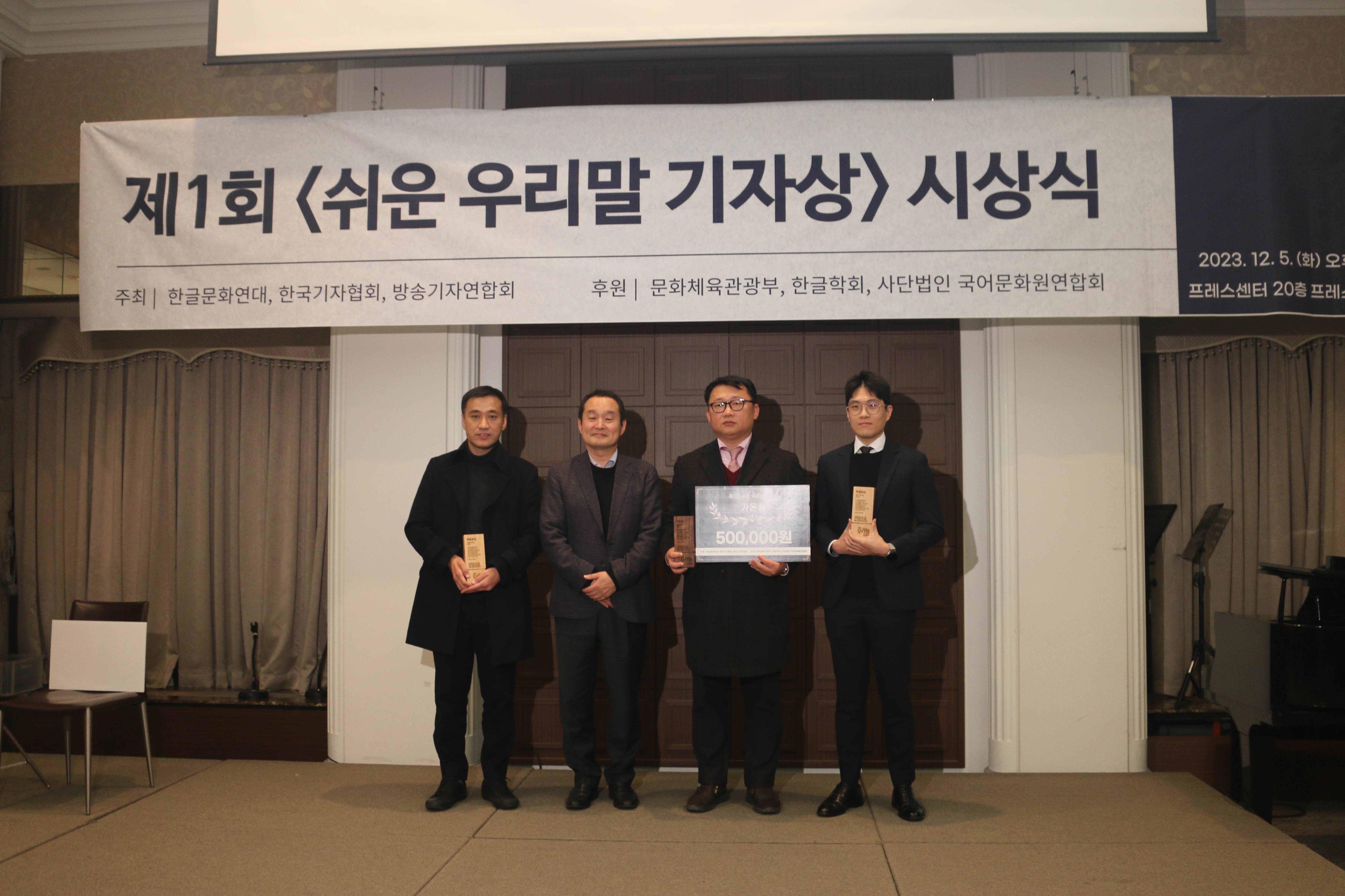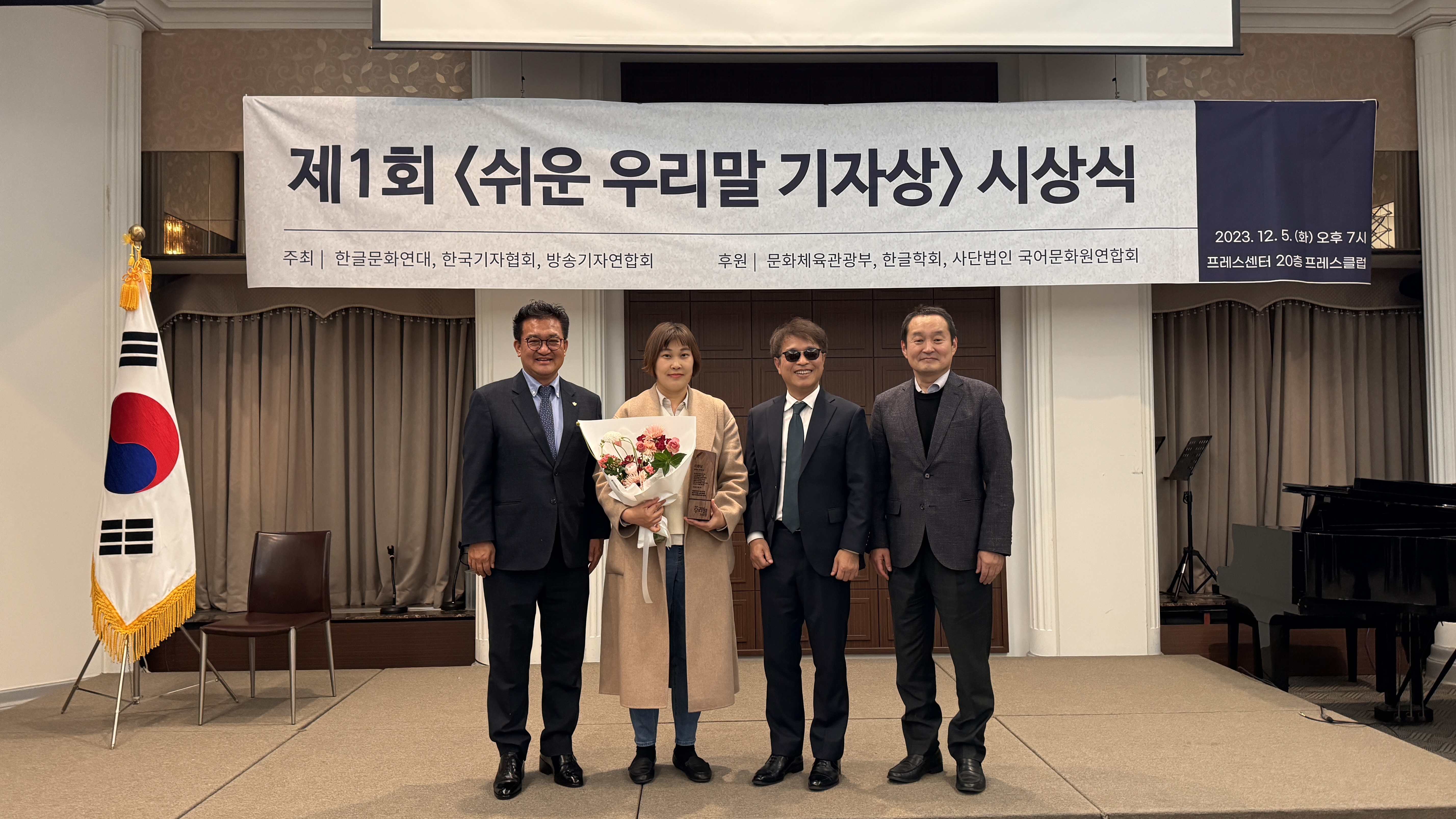 지난 12월 5일(화) 저녁 7시 프레스센터 20층 프레스클럽에서 쉬운 우리말 기사를 쓴 기자들을 선정해 <쉬운 우리말 기자상>을 수여하는 시상식이 열렸다. 한글문화연대(대표 이건범), 한국기자협회(회장 김동훈), 방송기자연합회(회장 양만희)가 공동 주최해 열린 이 시상식에는 70여 명이 참석해 상의 취지에 공감하며 수상자를 축하했다. 으뜸상을 받은 한겨레신문 임지선 기자는 70대 아버지와 초등학생인 아들이 보기에도 읽기 쉬운 기사를 쓰기 위해 노력했다며 으뜸상 수상 소감을 밝혔다.