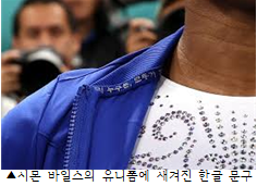 미국의 전설적인 기계체조 선수 시몬 바일스는 한글이 새겨진 유니폼을 입고 경기에 등장해 이목을 집중시켰다. 그녀의 유니폼 안쪽 깃에는 ‘누구든, 모두가’라는 한글 문구가 새겨져 있었다. 시몬 바일스는 2016년 리우데자네이루 올림픽에서 4개의 금메달을 획득하며 전 세계에 이름을 알렸다. 그러나 2021년 도쿄 올림픽에서는 극심한 중압감으로 인해 연달아 경기를 기권하면서 많은 팬들에게 안타까움을 남겼지만 이후 어려움을 극복하고 다시 올림픽 무대에 도전하였다. 선수가 공식적으로 해당 한글 문구에 대해 언급한 적은 없지만, 사람들은 인종, 성별, 국적을 초월한 평등과 포용의 메시지를 담은 올림픽 정신을 표현한 것으로 추측하며 많은 응원을 보냈다.