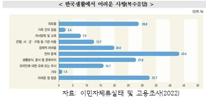 국내 거주 외국인들이 한국에 살면서 불편하다고 느끼는 요소에는 음식, 자녀양육, 외로움 등 다양한 이유가 존재하지만 ‘언어’가 가장 큰 이유로 꼽힌다.