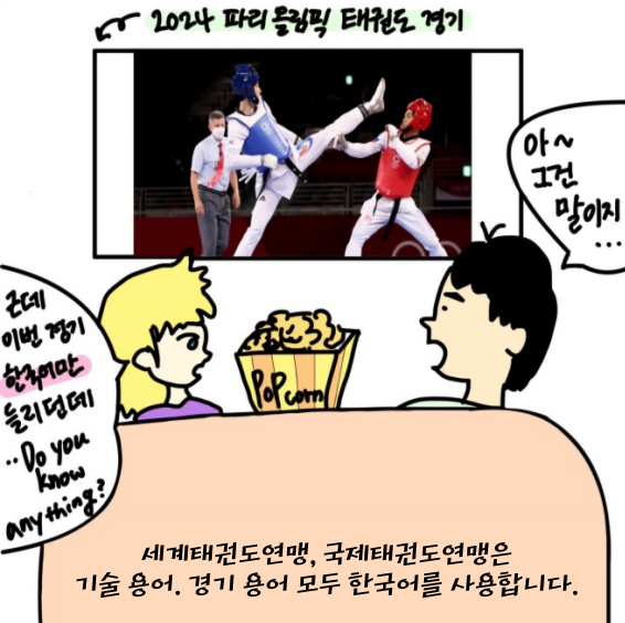 “인사!, 시작!... 경고!” 올해 여름에 열렸던 2024 파리올림픽 태권도 경기에서 실제 심판의 말이다. 세계적인 스포츠 대회인 올림픽에서 우리말이 들리다니, 처음 보는 사람들은 다들 신기하다는 반응이 많다. 스포츠 용어는 대부분 종목이 유래하게 된 국가의 언어를 쓰는 것이 일반적이다. 펜싱은 프랑스어를, 야구는 영어를, 유도는 일본어를 쓴다. 현재 태권도는 대한민국이 종주국이므로 실제 경기에 사용하는 모든 구령을 우리말로 진행한다.