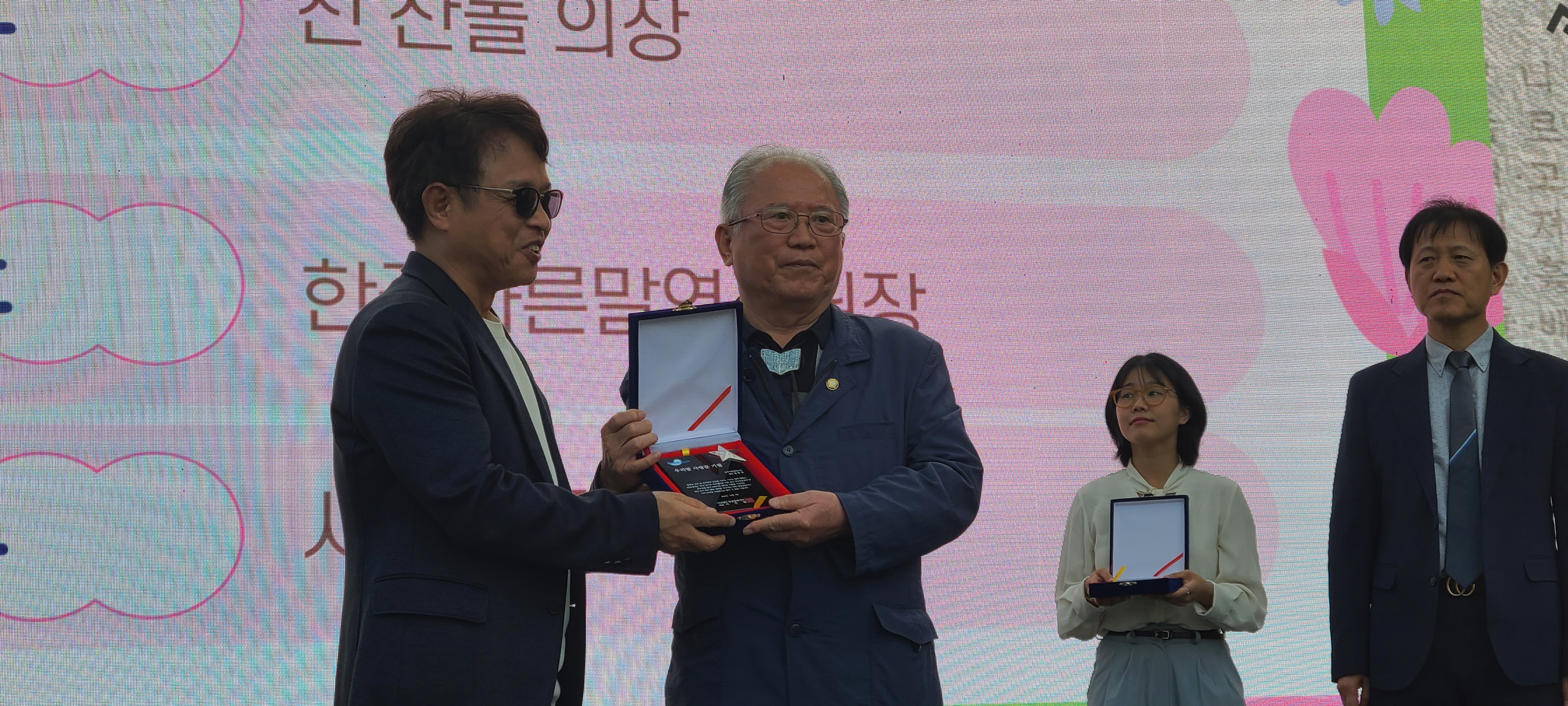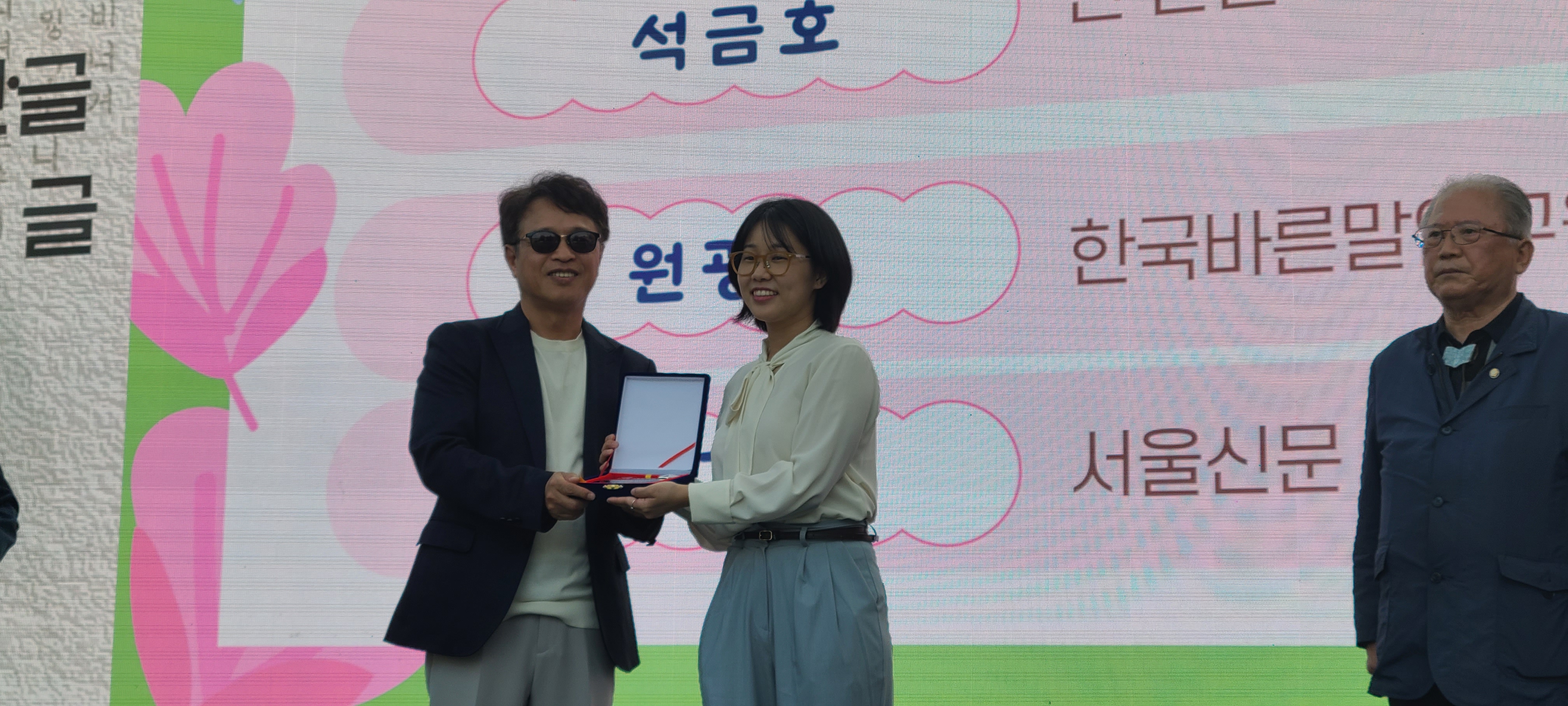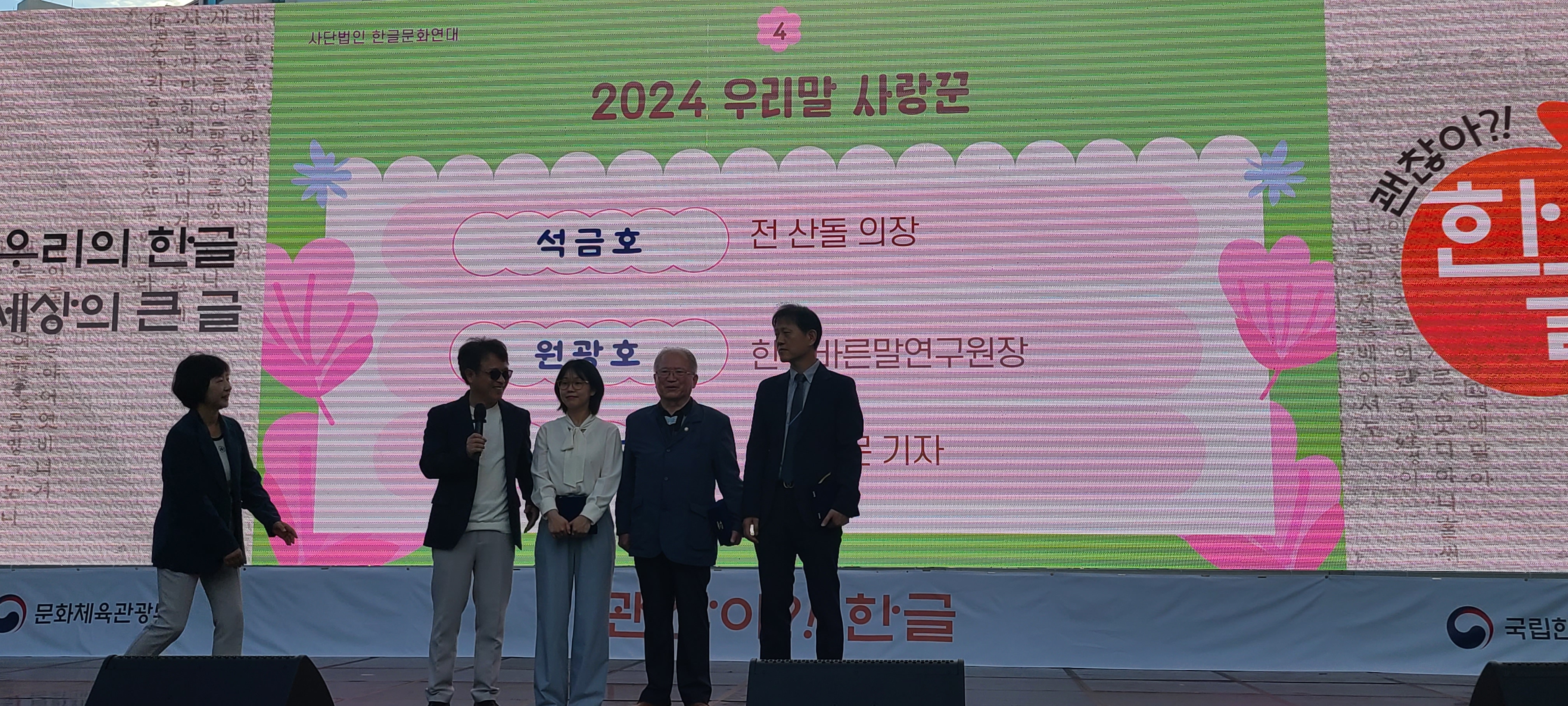 이후 순서는 2024 우리말 사랑꾼, 우리말 해침꾼 발표였습니다. 우리말 사랑꾼으로 석금호 전 산돌 의장, 원광호 한국바른말연구원장, 이경우 서울신문 기자 등 셋을, 우리말 해침꾼으로 김형찬 부산 강서구청장을 뽑았습니다.
