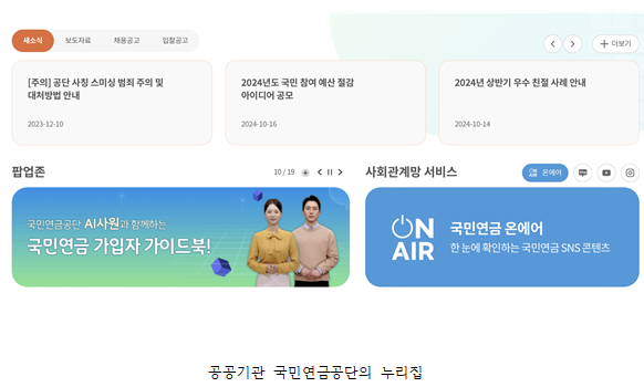 국민연금공단 누리집에서도 불필요한 외국어를 볼 수 있었다. ‘팝업존’은 국민연금공단의 여러 안내 사항을 보여주는 창이다. 이는 쉽게 ‘알림창’ 정도로 바꿔 쓸 수 있다. ‘팝업존’을 ‘알림창’ 또는 ‘알림’ 정도로 바꾸는 일이 간단해 보여도 이런 노력들이 공공기관의 외국어 남용을 줄이는 한 걸음, 한 걸음이 된다. ‘팝업존’ 옆 ‘ON AIR’라는 외국어도 보인다. 국민연금 온에어는 국민연금 관련 다양한 정보를 담은 누리집이다. ‘ON AIR’는 사전적으로 ‘방송 중인’이라는 뜻이다. 직관적으로 해석해 ‘국민연금 방송 중인’으로 순화하면 어색하니 어떤 내용인지를 알 수 있는 표현으로 순화가 필요해 보인다.