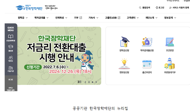 위 사진은 공공기관 한국장학재단의 누리집이다. 누리집을 접속했을 때 처음 볼 수 있는 화면이다. 사진 속에는 ‘QUICK MENU, 고졸만JOB, 멘토링’ 외국어들이 보인다. ‘QUICK MENU, 멘토링’은 쉽게 ‘빠른 메뉴, 상담’으로 쓸 수 있다. ‘고졸만JOB’은 처음 봤을 때 어떤 것을 말하는지 판단하기 어렵다. ‘고졸만JOB’을 누르면 바로 해당 누리집으로 접속하게 된다. ‘고졸만 JOB’은 교육부와 한국장학재단이 고졸 채용 관련 정보를 한 자리에서 볼 수 있도록 구축한 고졸 취업 지원 전용 운영 체제이다. 좋은 취지로 시작한 운영 체제의 이름을 사람들이 보고 단번에 파악해 더 활발히 이용할 수 있도록 쉬운 용어로 하는 것이 좋지 않을까?