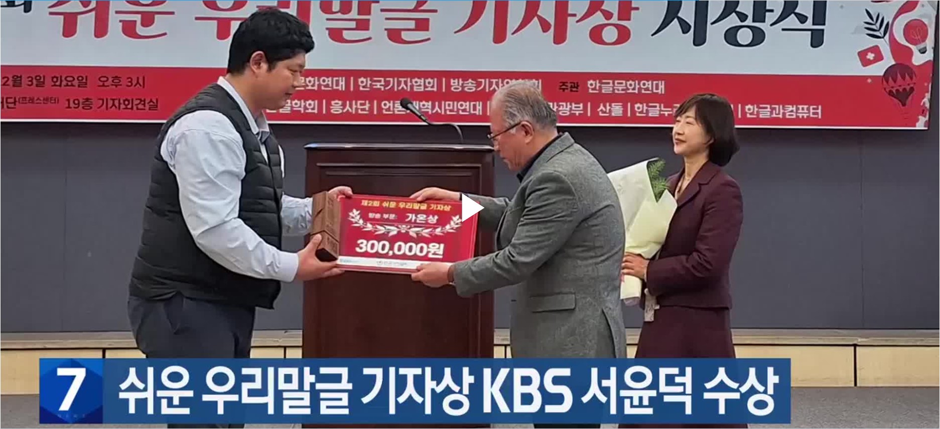 사단법인 한글문화연대 주관으로 오늘(3) 서울 한국프레스센터에서 열린 제2회 쉬운 우리말글 기자상 시상식에서 KBS 전주방송총국 서윤덕 기자가 방송 부문 '가온상'을 수상했습니다.