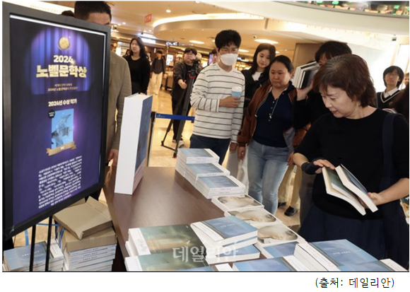 “유튜브나 누리소통망에서 짧은 영상만 보는데 시간을 쏟았는데 이번 주말에는 한강 작가의 책을 구매하러 서점에 왔어요.” 교보문고 종로점에서 직장인 정모씨는 한강의 노벨문학상 수상 소식을 접한 뒤 새로운 주말 계획을 세웠다며 이렇게 말했다. 한국인 최초로 노벨문학상을 수상하며 한동안 한국 사회에 책 읽는 분위기가 무르익을 것이라 예상된다.