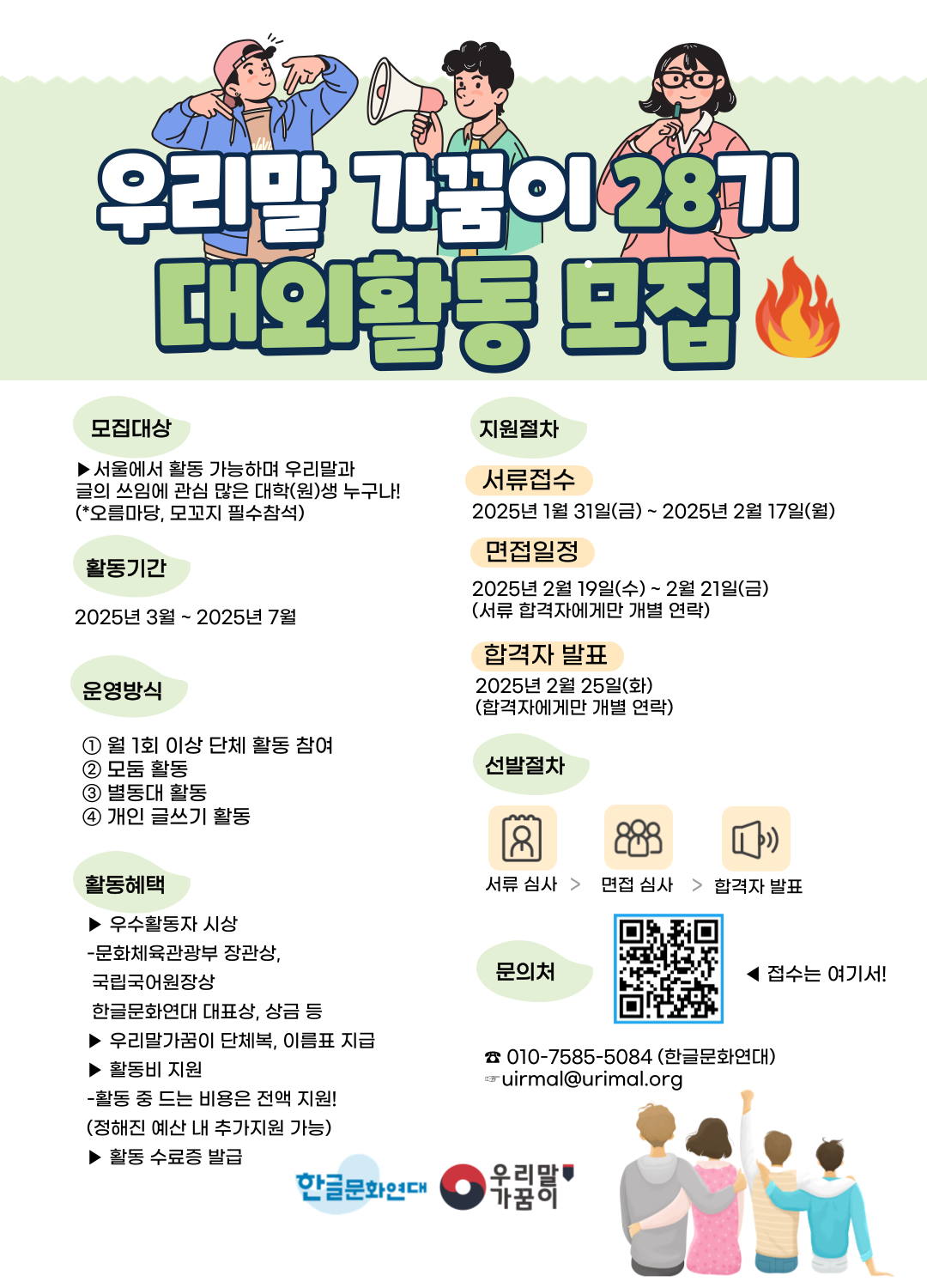 사단법인 한글문화연대(대표 이건범)에서는 우리말과 한글을 가꾸고 지키는 대학생 연합동아리 ‘우리말가꿈이 28기’를 모집하고 있습니다.