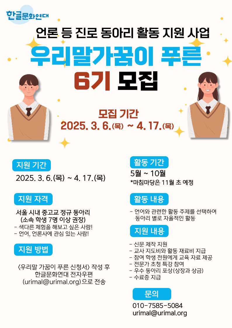 사단법인 한글문화연대는 국민의 국어능력 향상을 목표로, 청소년의 진로 중 언어 능력을 갖춰야 할 언론홍보, 방송, 창작, 광고, 복지, 어문 분야의 동아리 활동을 지원합니다.