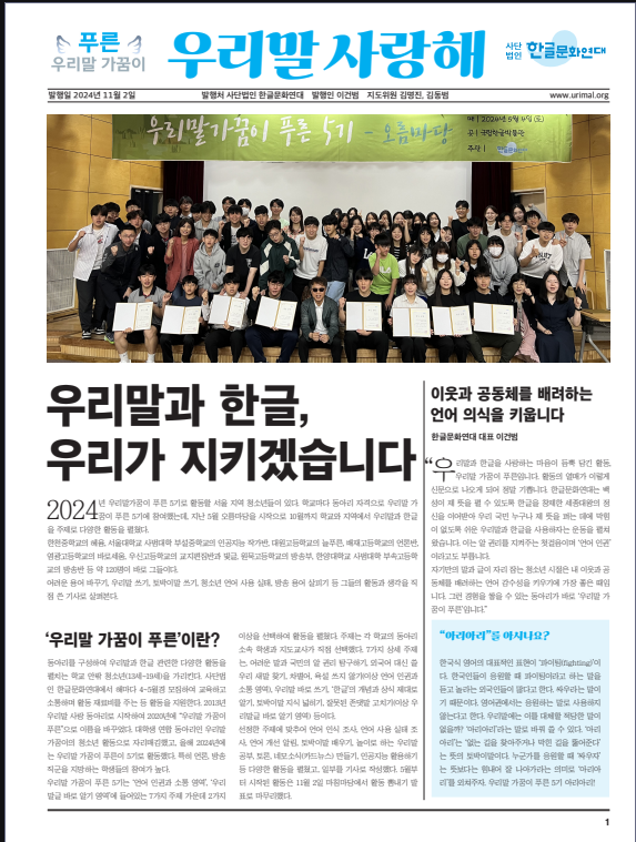 | [마침] 우리말가꿈이 푸른 5기 마침마당(24.11.02) (0) | 2024.11.07 |