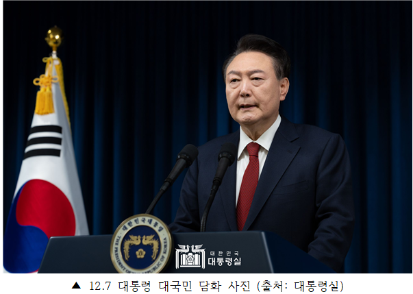 당시 케이티비(KTV) 국민방송을 통해 송출된 윤 대통령의 담화 화면에는 수어 통역이 제공되지 않았다. 실제로 비상계엄 긴급담화 당시 뉴스 특보를 편성한 지상파 3사와 종합편성채널 4사 중 수어로 동시 통역을 제공한 방송사는 한국방송(KBS)뿐이었다.