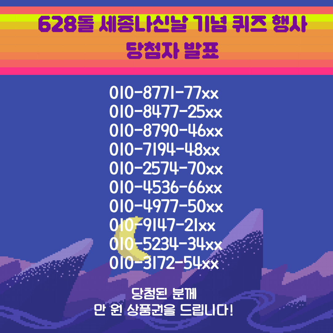 | [알림] 628돌 세종나신날 기념 퀴즈 행사(~5월 26일까지) (0) | 2025.05.07 |