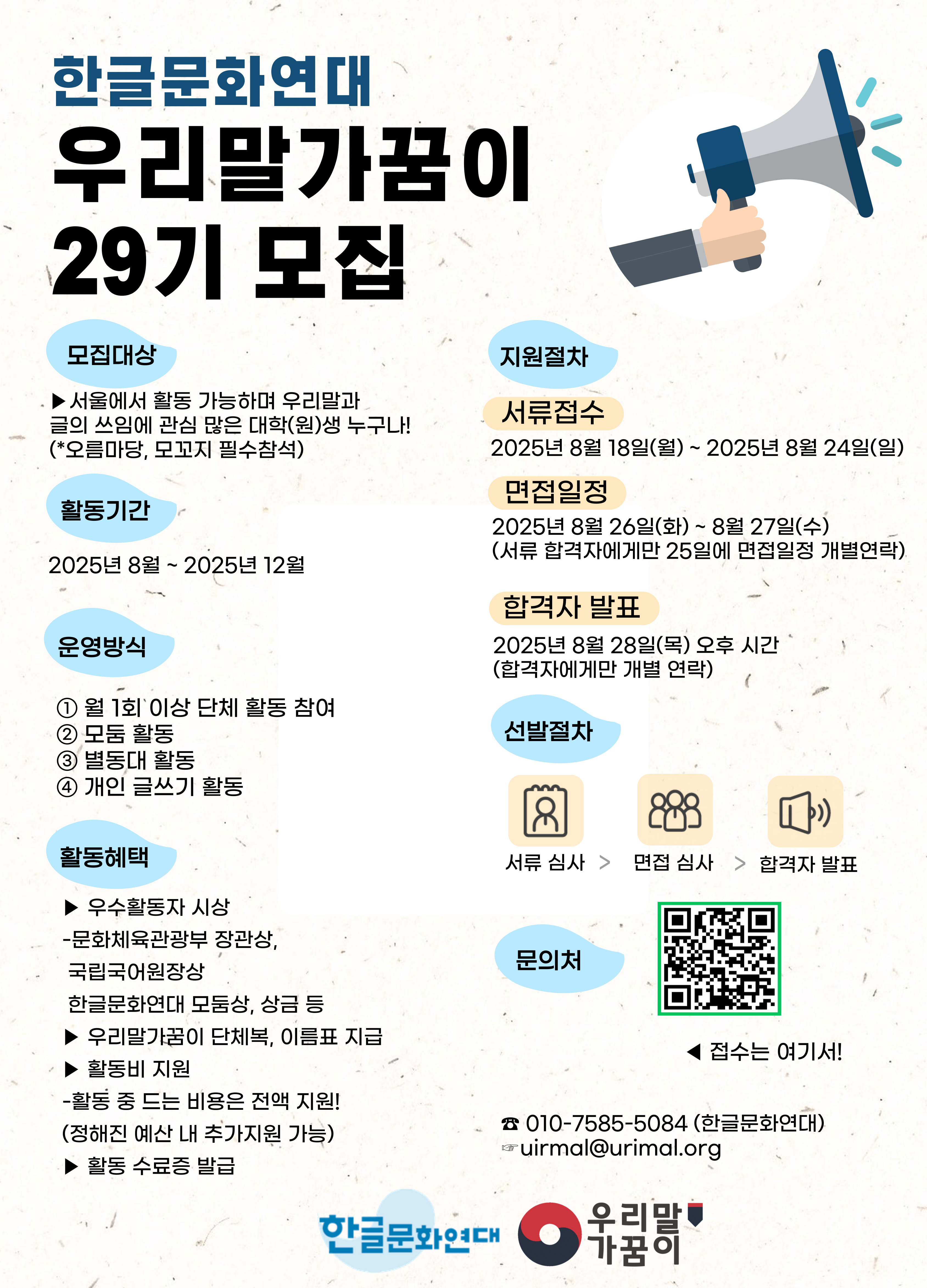 | [알림] 우리말가꿈이 29기 모집(~8월 17일까지) (12) | 2025.07.24 |