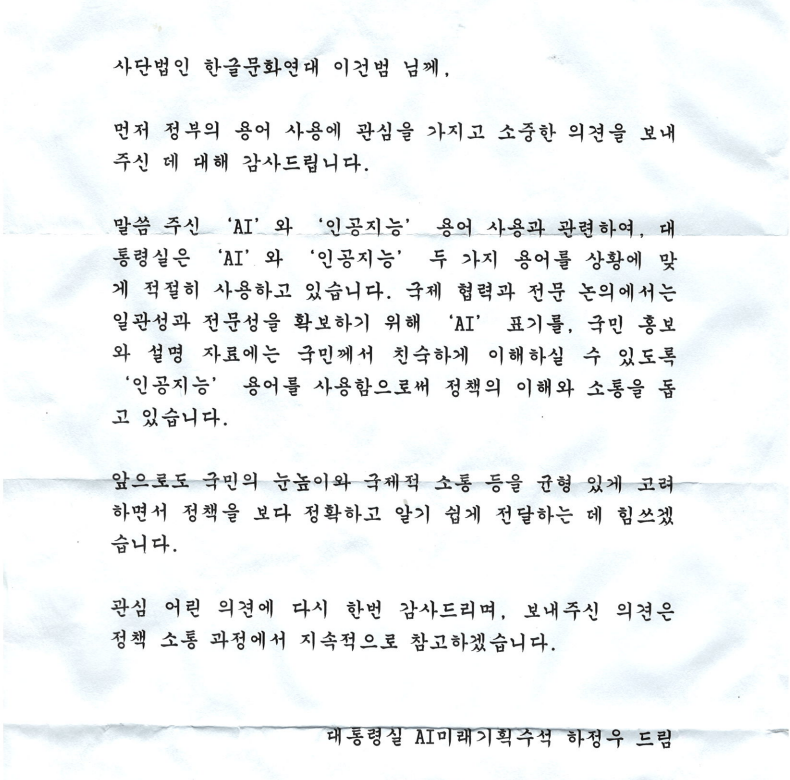 4. 우리 한글문화연대에서는 대통령실에서 ‘인공지능미래기획수석’이라는 직함 대신 ‘AI미래기획수석’이라는 이름을 사용하는 것에 반대합니다. 그렇게 사용하면 하정우 수석의 명함에도 그렇게 적을 테고, 모든 정책 이름이나 용어 사용에서 ‘AI’라고 적게 될 것입니다. 이는 대통령실을 비롯한 정부의 용어 사용에서 로마자 약어 남용과 외국어 남용을 부추길 위험이 매우 큽니다. 대통령의 공식적인 용어 사용과도 어울리지 않습니다. 이에 다음과 같이 요청합니다.