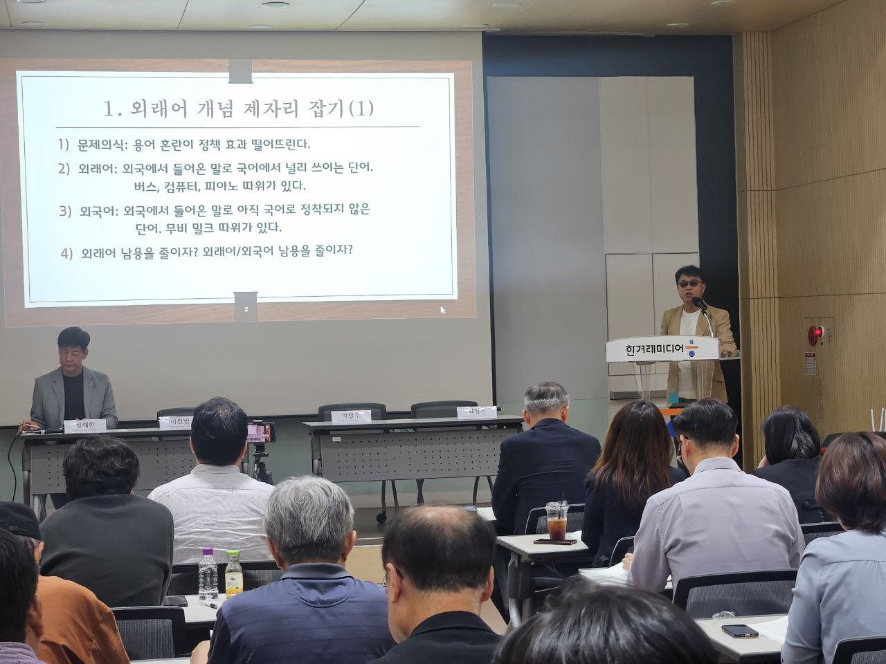 이번 토론회는 “공공언어 속 외국낱말, 외국문자 줄일 방안”을 주제로 하여 한글문화연대 이건범 대표, 대구대 이정복 교수, 교원대 김석용 교수가 각각 발표를 하고 토론자와 방청객이 이에 대해 토론하는 시간을 갖는 시간이었습니다.