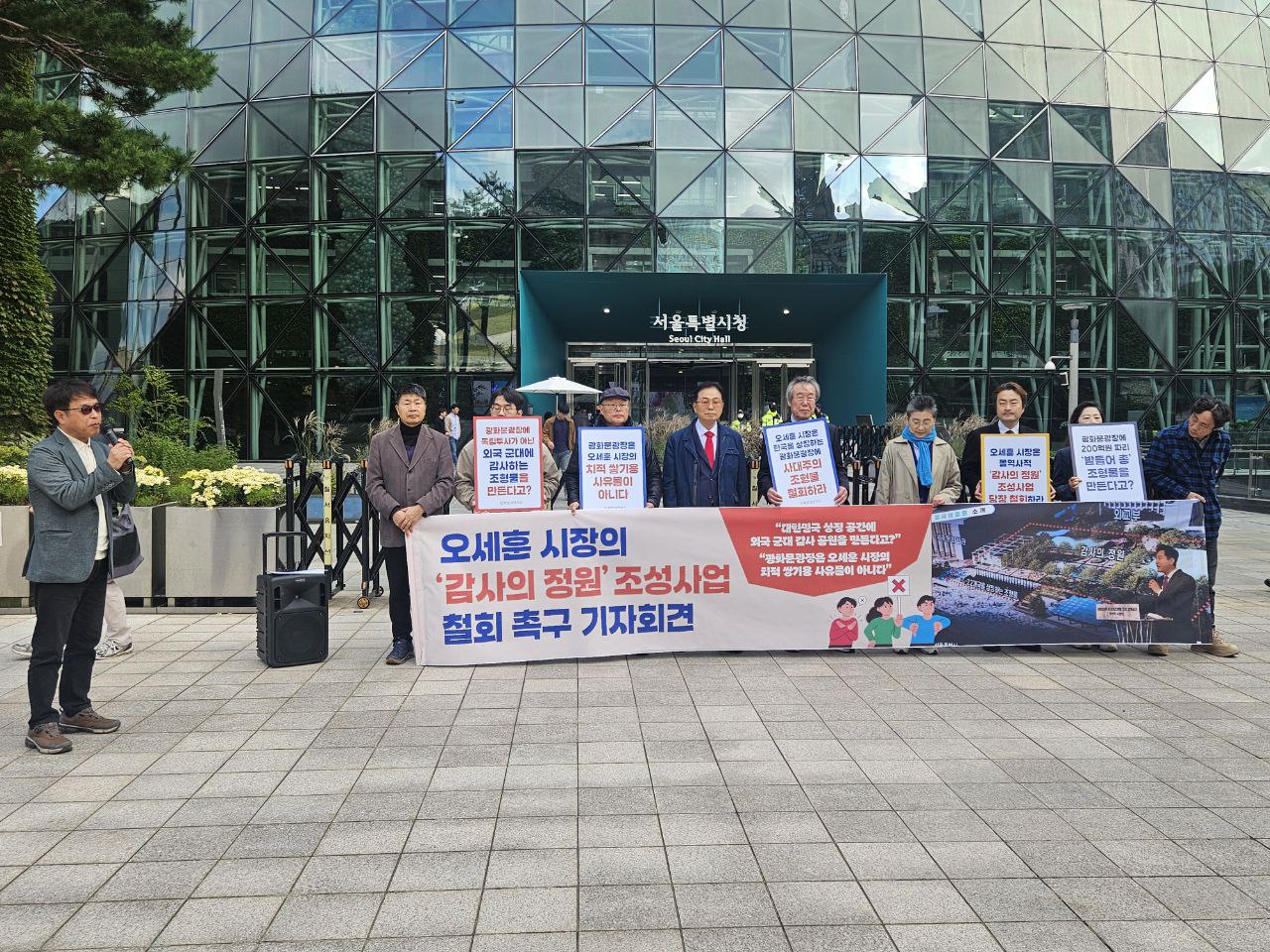 10월 23일 목요일 이른 아침, 한글단체 75개가 모여 오세훈 시장의 광화문 광장 '감사의 정원' 조성 사업을 즉각 중단 요구하기 위해 서울 시청 앞에서 반대 기자회견을 열었다.