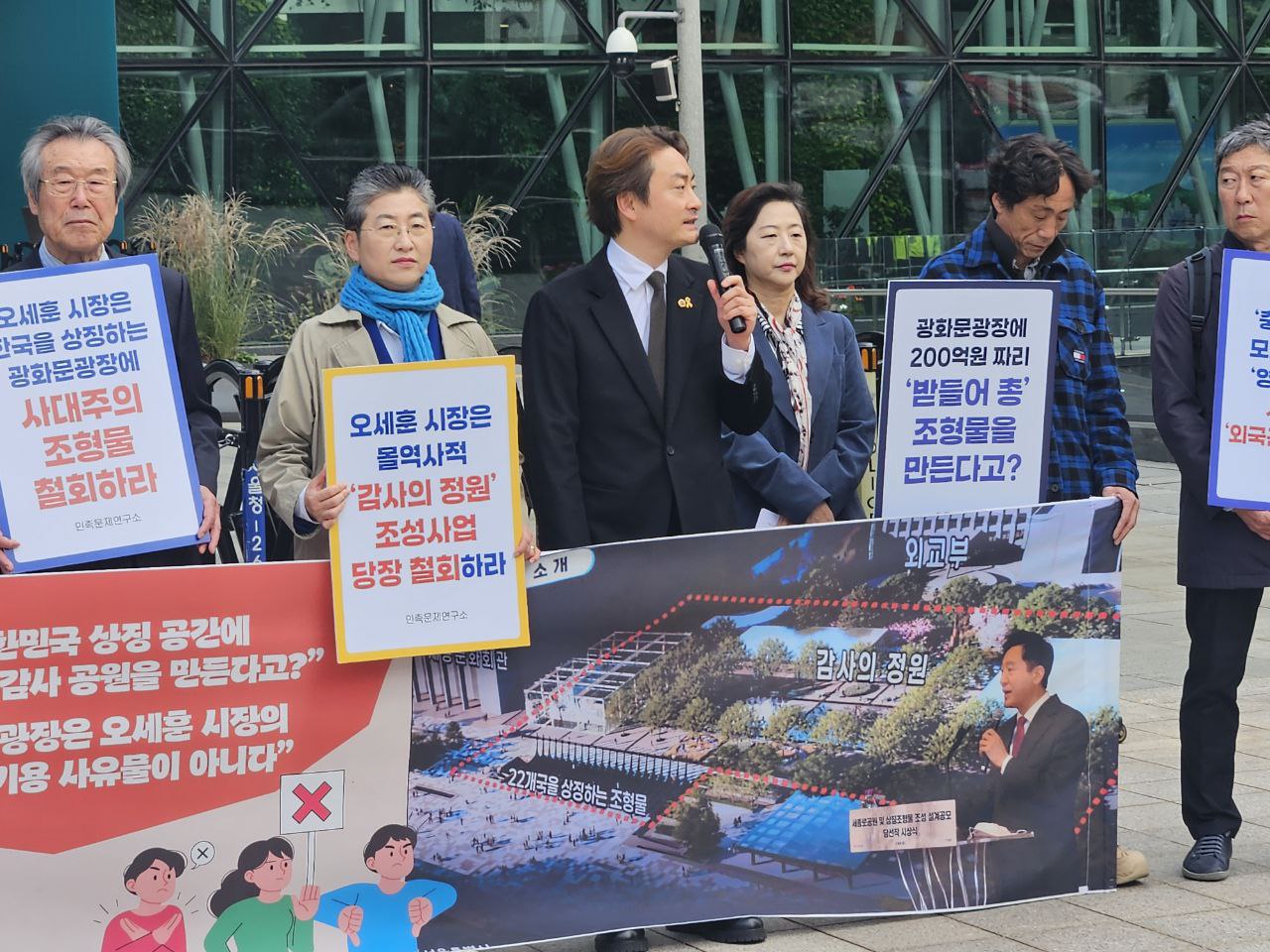 오세훈 시장은 한글의 성지이자 민주주의의 상징 공간인 광화문광장에 6.25 참전국을 기리는 '감사의 정원'을 만들려 하고 있다. '받을어 총' 모양의 이 시설 공간은 민주주의의 성지인 광화문 광장의 역사를 왜곡하고 있다. 광화문 광장은 4.19 혁명이래 민주주의 성지이며 자랑스러운 한글을 보여주는 '글자마당'을 포함하는 공간이기도 하다.
