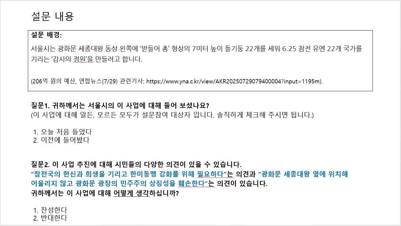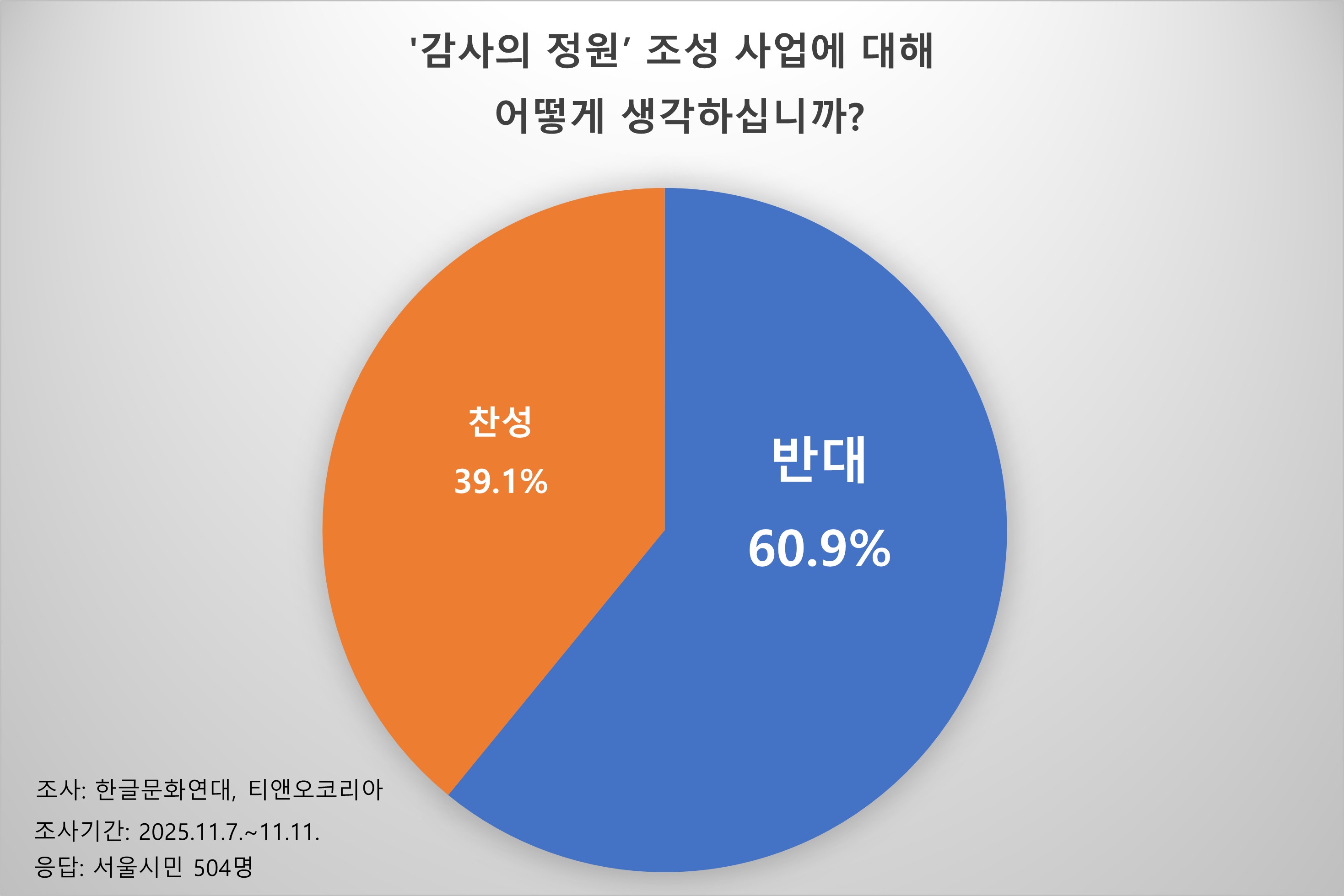 서울시 성인 남녀 504명에게 서울시가 광화문 광장에 조성하려는 ‘감사의 정원’ 사업에 관한 의견을 물어본 결과 60.9%가 반대하는 것으로 나타났다. 서울시는 206억 원을 들여 광화문 세종대왕 동상 왼쪽에 ‘받들어 총’ 형상의 6.25미터 높이 돌기둥 23개를 세워 6.25 참전 유엔 22개 국가를 기리는 ‘감사의 정원’을 만들려고 한다. 60대 이상을 제외한 전 연령대에서 반대 의견이 높았다. 50대(65.1%), 30대(64.1%), 40대(60.1%), 20대(53.8%) 순으로 반대 의견이 높았고, 60대 이상에서는 44.0%가 반대하는 것으로 나타났다.