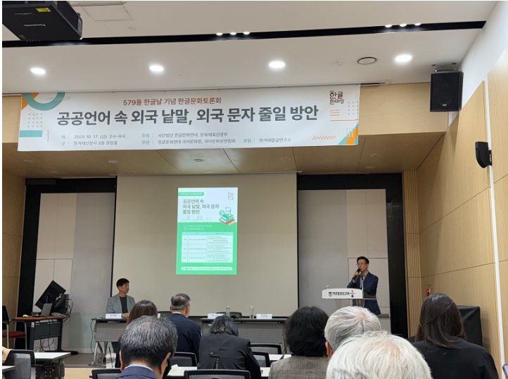 지난 10월 17일, 한글문화연대와 문화체육관광부가 공동으로 주최한 제579돌 한글날 기념 ‘2025 한글문화토론회’가 한겨레신문사 청암홀에서 열렸다. ‘공공언어 속 외국 낱말, 외국 문자 줄일 방안’을 주제로 열린 이번 토론회에서는 세 가지 소주제가 순차적으로 논의되었으며, 그중 두 번째 주제인 ‘국제기구의 한국어 줄임말 사용 방안’을 중심으로, 외국어 약칭 중심의 공공언어 현실과 한글화의 방향을 논의하였다.