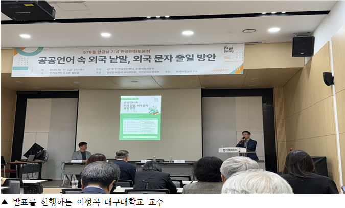 이날 발표를 맡은 이정복 대구대학교 교수는 “국제기구의 명칭이 대부분 영문 약칭으로만 통용되고 있다”는 점을 문제로 제기하며 발표를 시작했다. 그는 “UN, WTO, OECD처럼 외국어 약칭만 쓰는 현실은 단순한 표기 문제가 아니라 국민의 정보 접근권과 언어 주권이 걸린 문제”라고 강조했다. 이 교수는 64개 주요 국제기구의 명칭을 분석한 결과, 한국어 줄임말 사용률이 평균 18.6%에 불과하다고 밝혔다. ‘세계보건기구(WHO)’나 ‘국제통화기금(IMF)’처럼 익숙하게 자리 잡은 일부 사례를 제외하면, 대부분의 국제기구 명칭은 여전히 로마자 약칭으로만 사용되고 있었다. 그는 “발음의 자연스러움, 의미 전달력, 국민 인지도 등을 종합적으로 고려한 한글형 줄임말의 표준화가 필요하다”며 “이는 단순한 순화가 아니라 국민의 이해를 위한 언어 복지의 실천”이라고 덧붙였다.